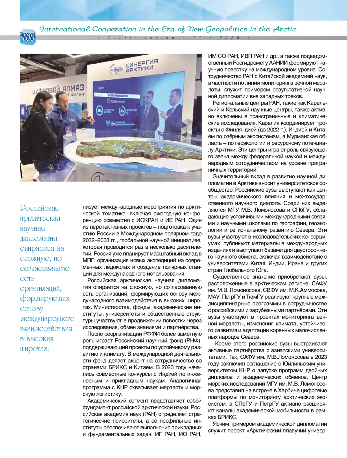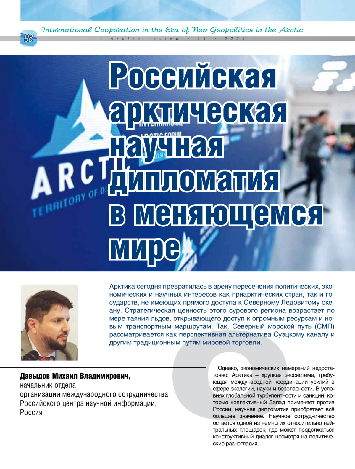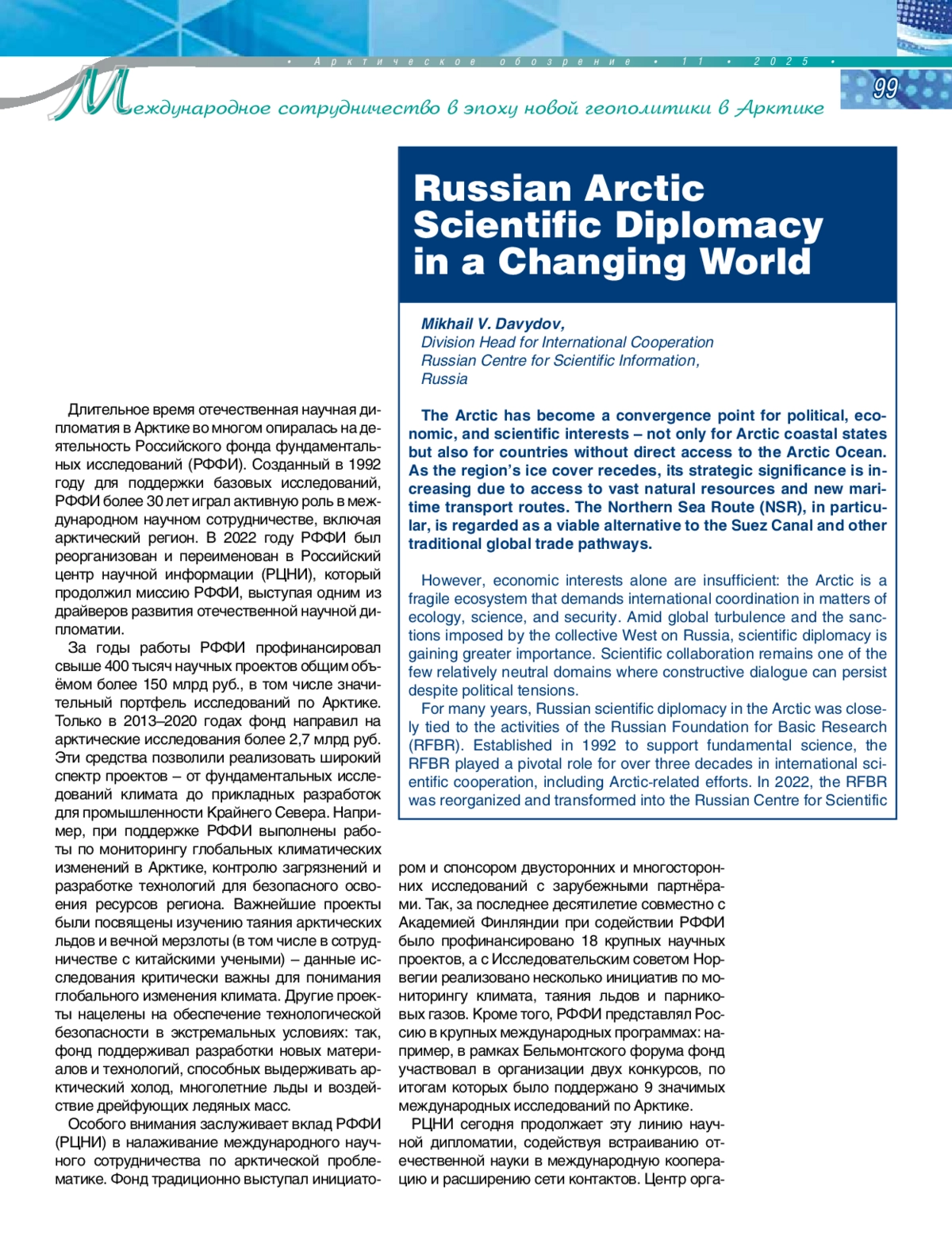 ДАВЫДОВ М. В. РОССИЙСКАЯ АРКТИЧЕСКАЯ НАУЧНАЯ ДИПЛОМАТИЯ В МЕНЯЮЩЕМСЯ МИРЕ // АРКТИЧЕСКОЕ ОБОЗРЕНИЕ. 2025. № 11