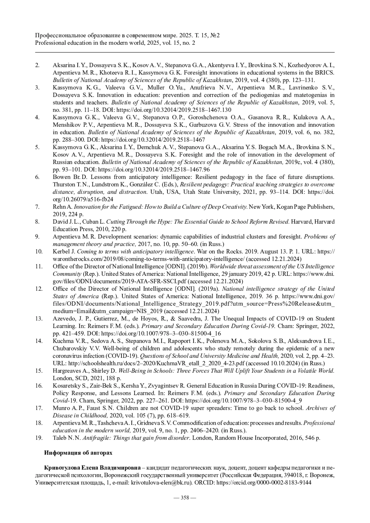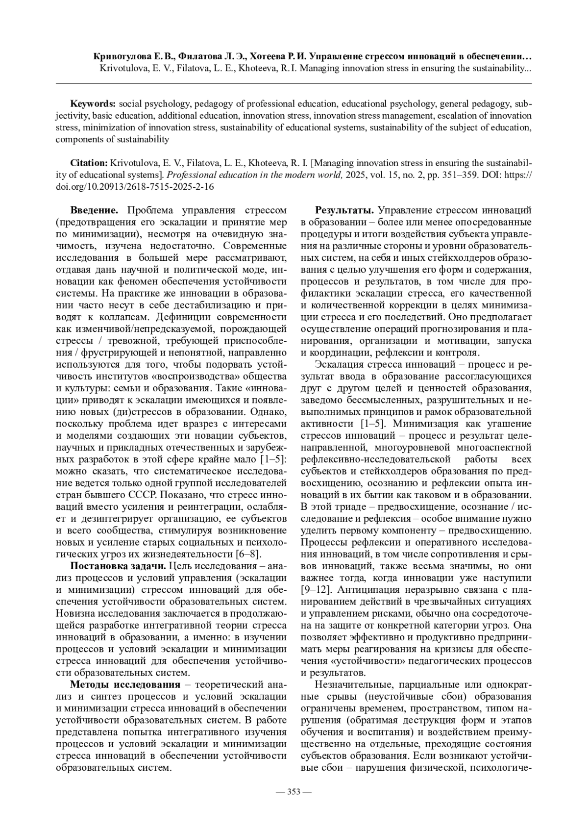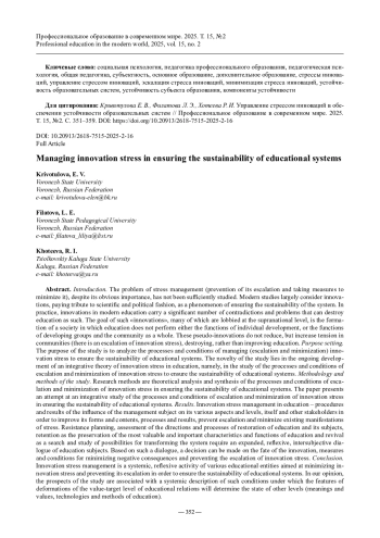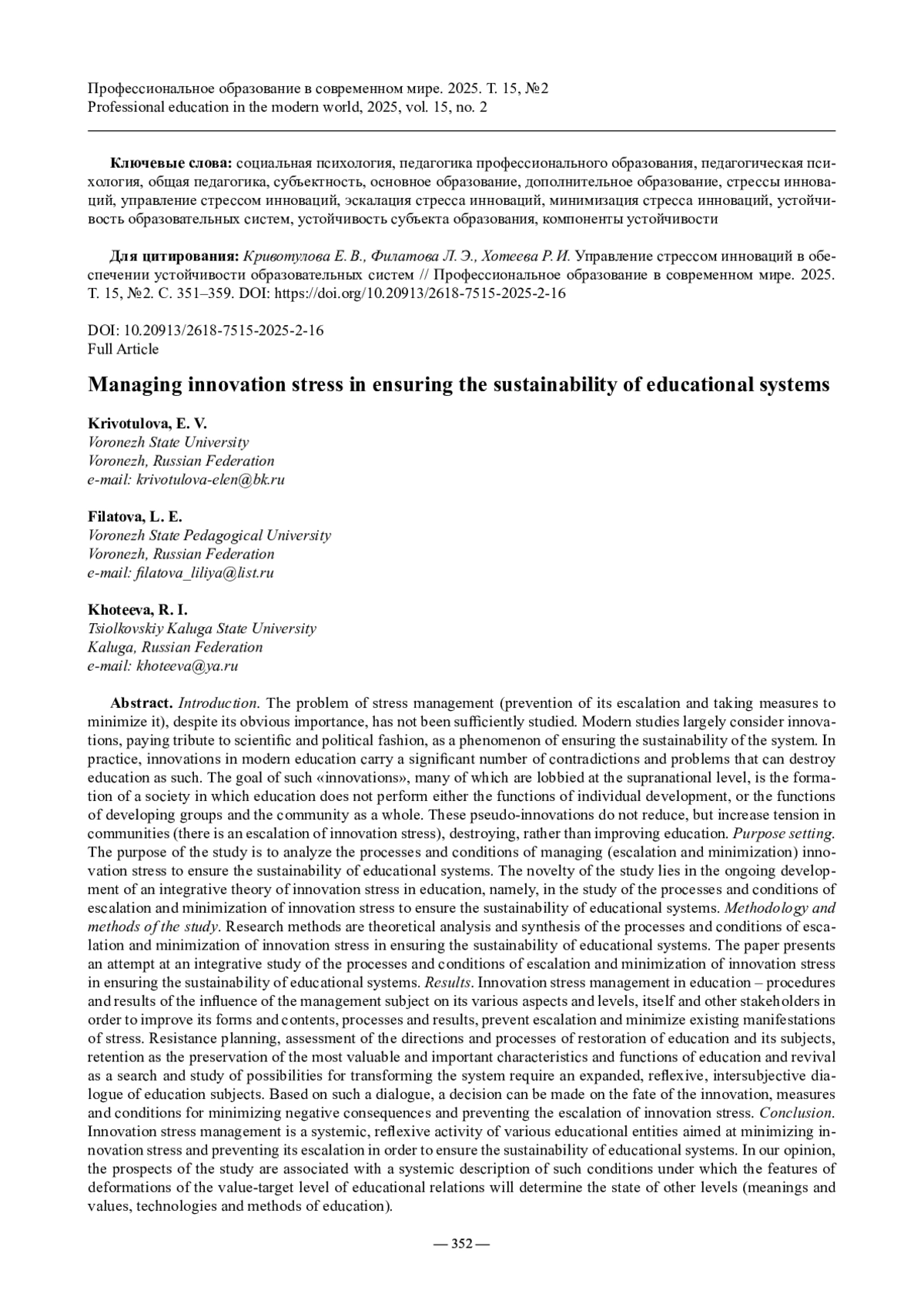 КРИВОТУЛОВА Е. В., ФИЛАТОВА Л. Э., ХОТЕЕВА Р. И. УПРАВЛЕНИЕ СТРЕССОМ ИННОВАЦИЙ В ОБЕСПЕЧЕНИИ УСТОЙЧИВОСТИ ОБРАЗОВАТЕЛЬНЫХ СИСТЕМ // ПРОФЕССИОНАЛЬНОЕ ОБРАЗОВАНИЕ В СОВРЕМЕННОМ МИРЕ. 2025. Т. 15, № 2