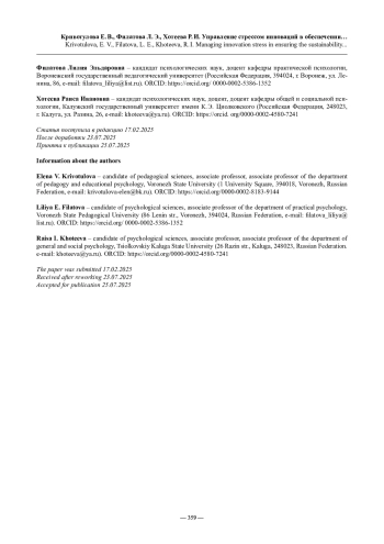 Ключевые фразы: социальная психология, педагогика профессионального образования, педагогическая психология, общая педагогика, СУБЪЕКТНОСТЬ, основное образование, дополнительное образование, стрессы инноваций, управление стрессом инноваций, эскалация стресса инноваций, минимизация стресса инноваций, устойчивость образовательных систем, устойчивость субъекта образования, компоненты устойчивости