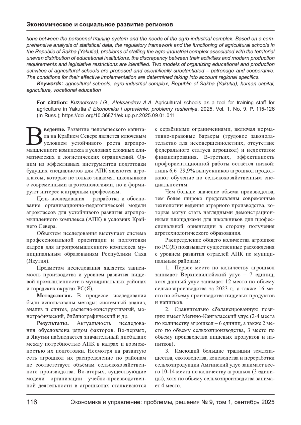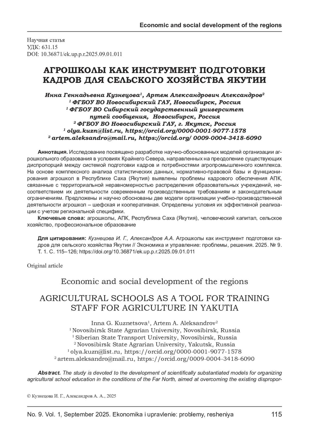 Исследование посвящено разработке научно-обоснованных моделей организации агрошкольного образования в условиях Крайнего Севера, направленных на преодоление существующих диспропорций между системой подготовки кадров и потребностями агропромышленного комплекса. На основе комплексного анализа статистических данных, нормативно-правовой базы и функционирования агрошкол в Республике Саха (Якутия) выявлены проблемы кадрового обеспечения АПК, связанные с территориальной неравномерностью распределения образовательных учреждений, несоответствием их деятельности современным производственным требованиям и законодательным ограничениям. Предложены и научно обоснованы две модели организации учебно-производственной деятельности агрошкол - шефская и кооперативная. Определены условия их эффективной реализации с учетом региональной специфики.