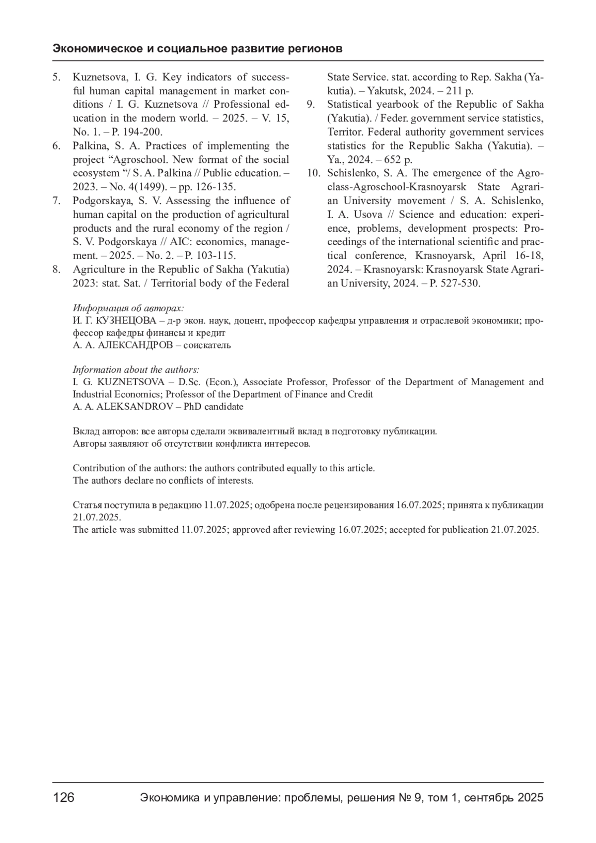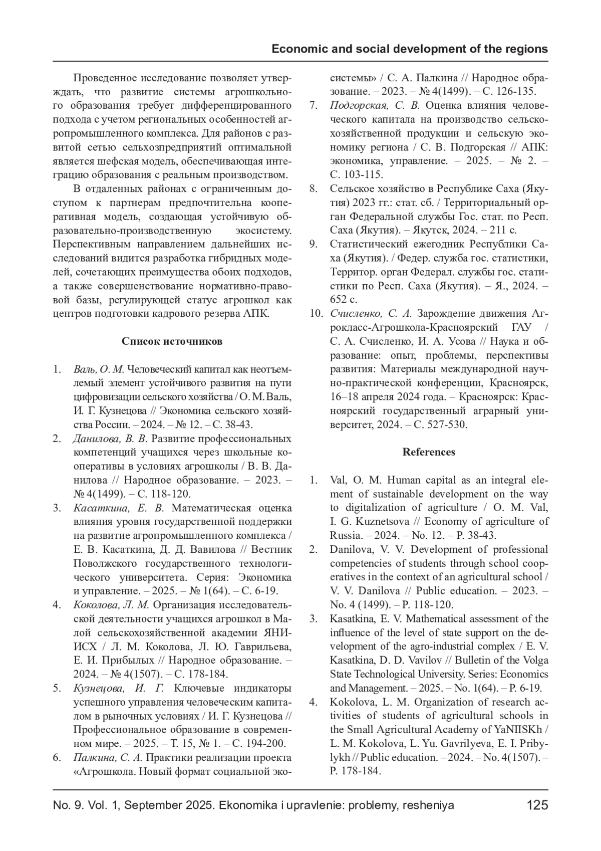 7. Подгорская, С. В. Оценка влияния человеческого капитала на производство сельскохозяйственной продукции и сельскую экономику региона / С. В. Подгорская // АПК: экономика, управление. - 2025. - № 2. - С. 103-115.