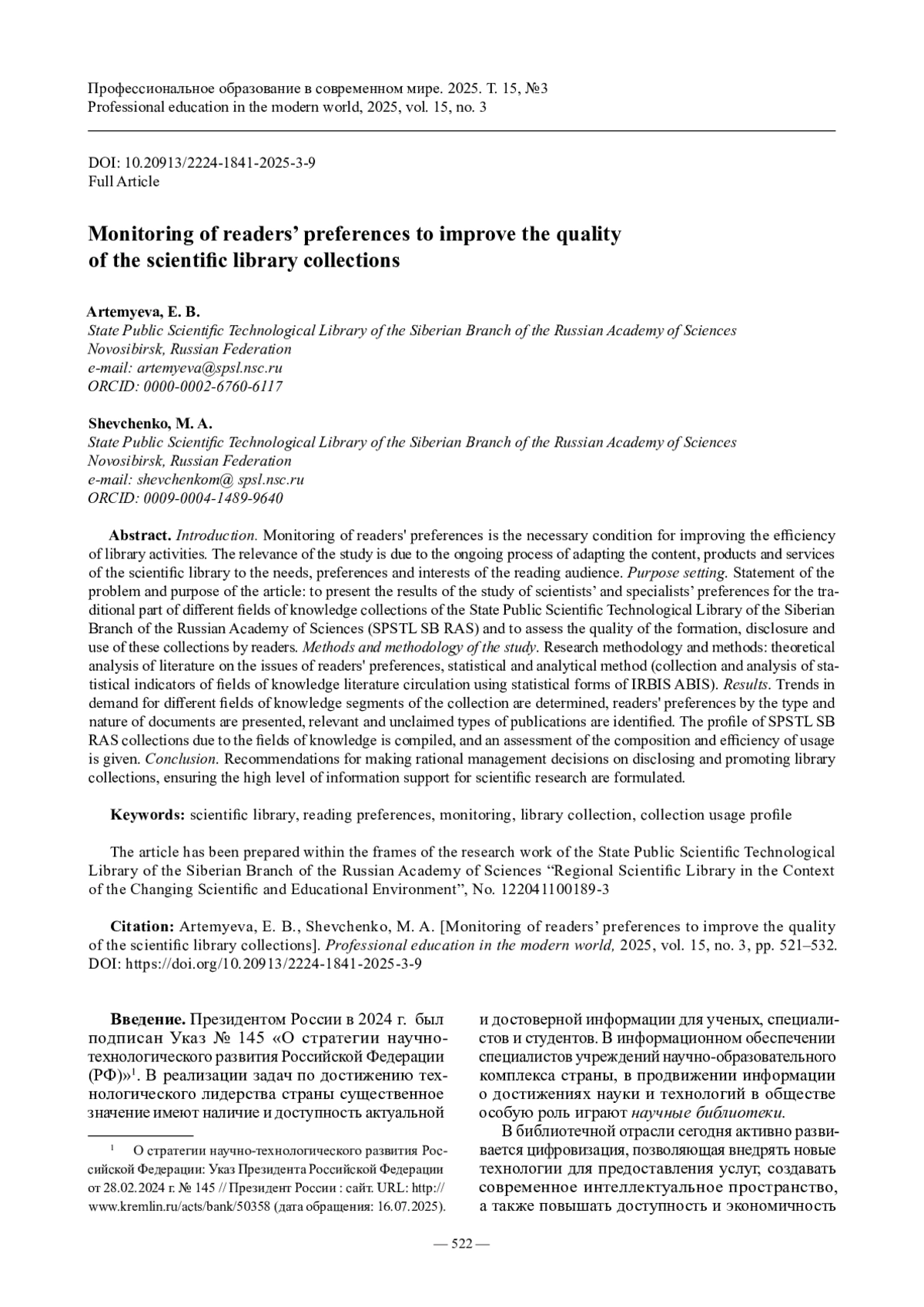 Введение. Мониторинг читательских предпочтений является необходимым условием повышения эффективности деятельности библиотеки. Актуальность исследования обусловлена постоянным процессом адаптации контента, продуктов и услуг научной библиотеки к потребностям, предпочтениям и интересам читательской аудитории.