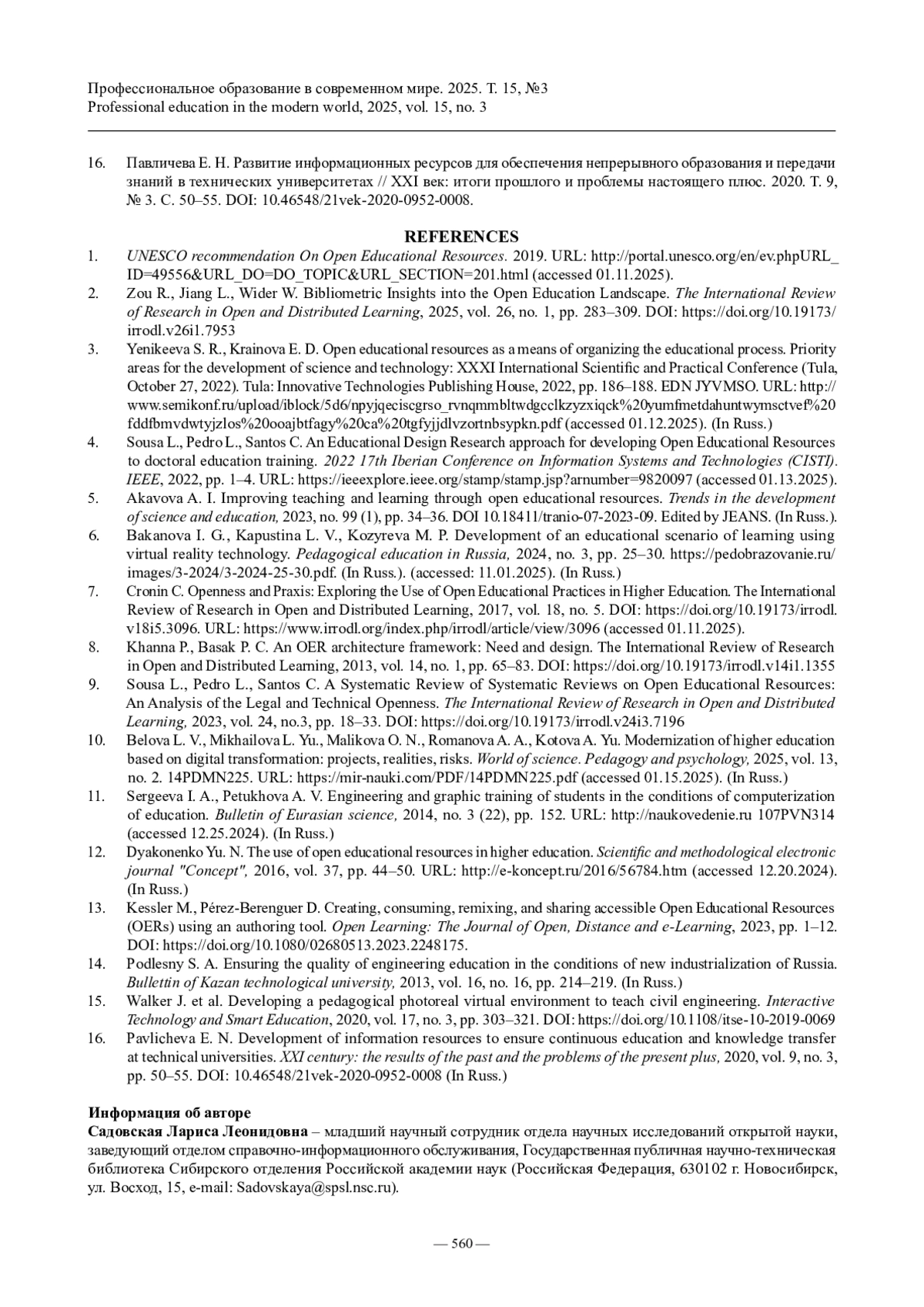 16. Павличева Е. Н. Развитие информационных ресурсов для обеспечения непрерывного образования и передачи знаний в технических университетах // XXI век: итоги прошлого и проблемы настоящего плюс. 2020. Т. 9, № 3. С. 50-55. https://doi.org/10.46548/21vek-2020-0952-0008.