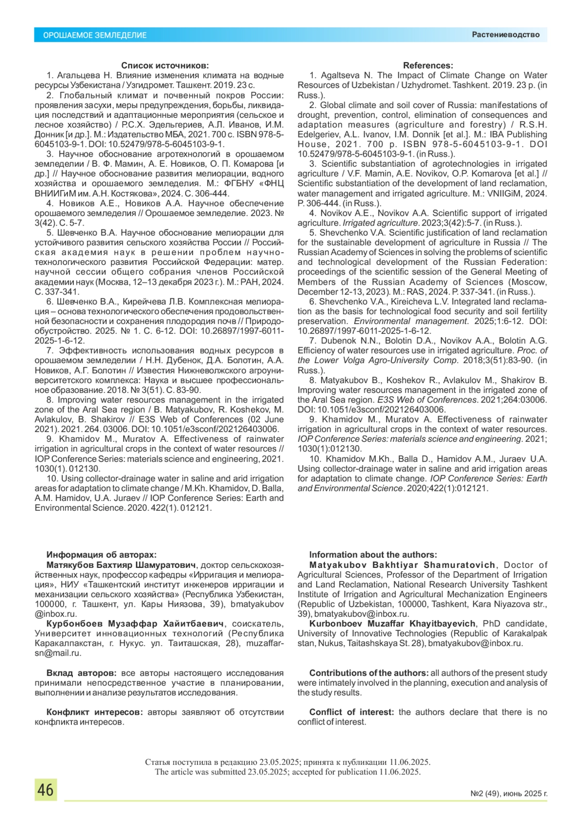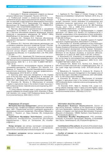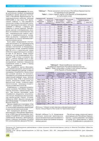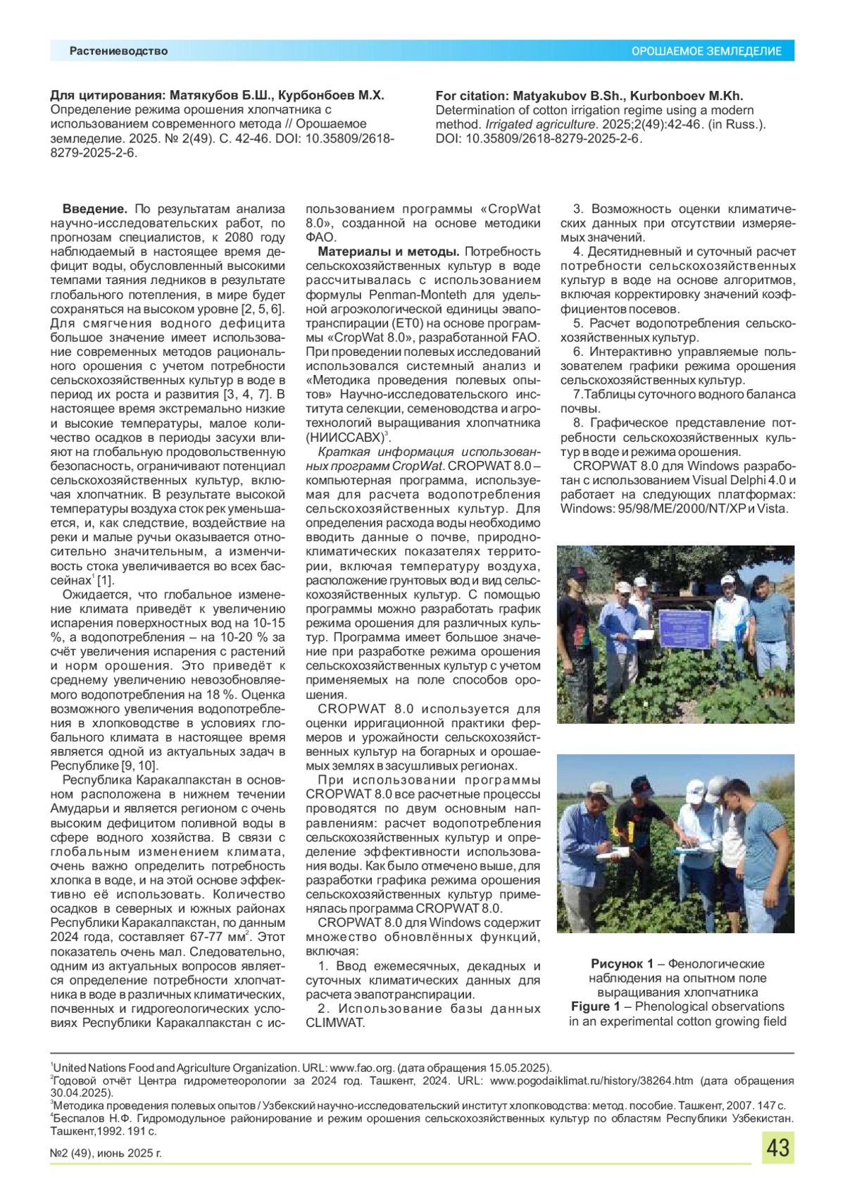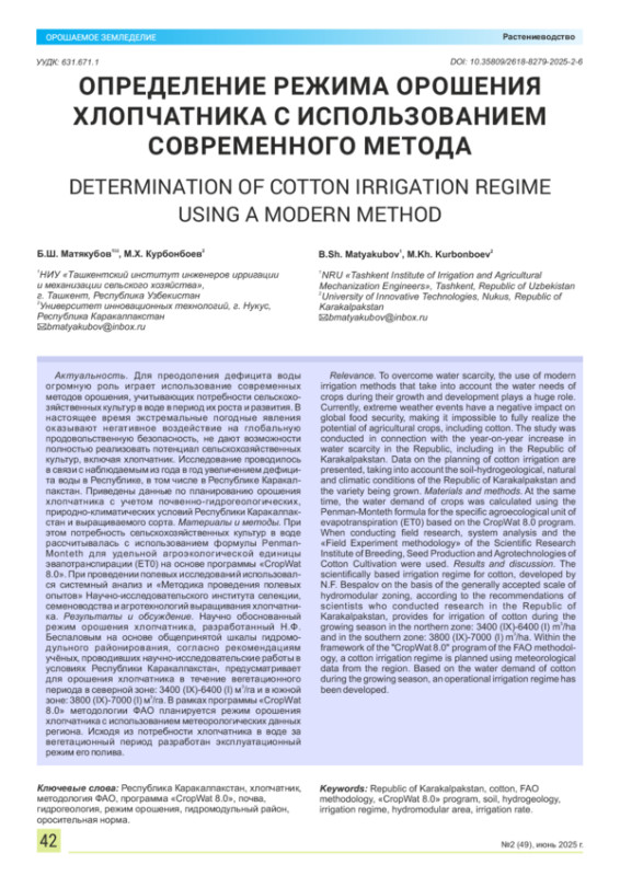 Статья: ОПРЕДЕЛЕНИЕ РЕЖИМА ОРОШЕНИЯ ХЛОПЧАТНИКА С ИСПОЛЬЗОВАНИЕМ СОВРЕМЕННОГО МЕТОДА (2025)