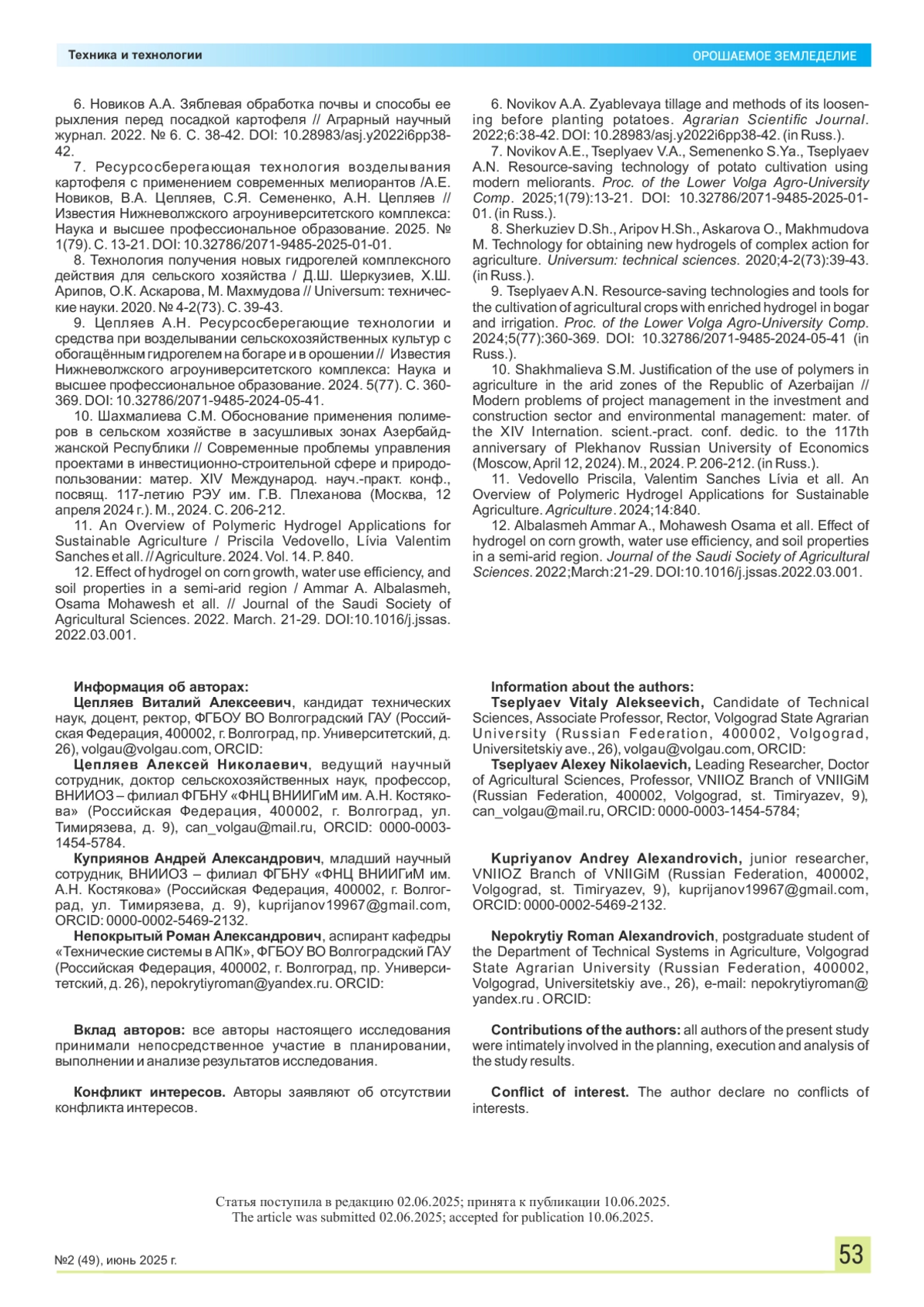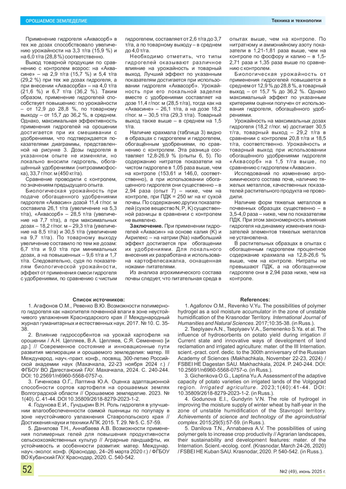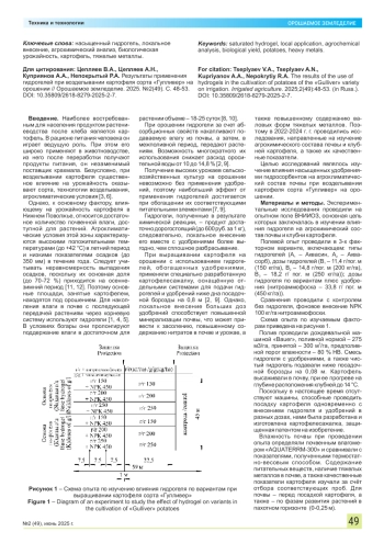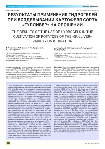 Статья: РЕЗУЛЬТАТЫ ПРИМЕНЕНИЯ ГИДРОГЕЛЕЙ ПРИ ВОЗДЕЛЫВАНИИ КАРТОФЕЛЯ СОРТА «ГУЛЛИВЕР» НА ОРОШЕНИИ (2025)