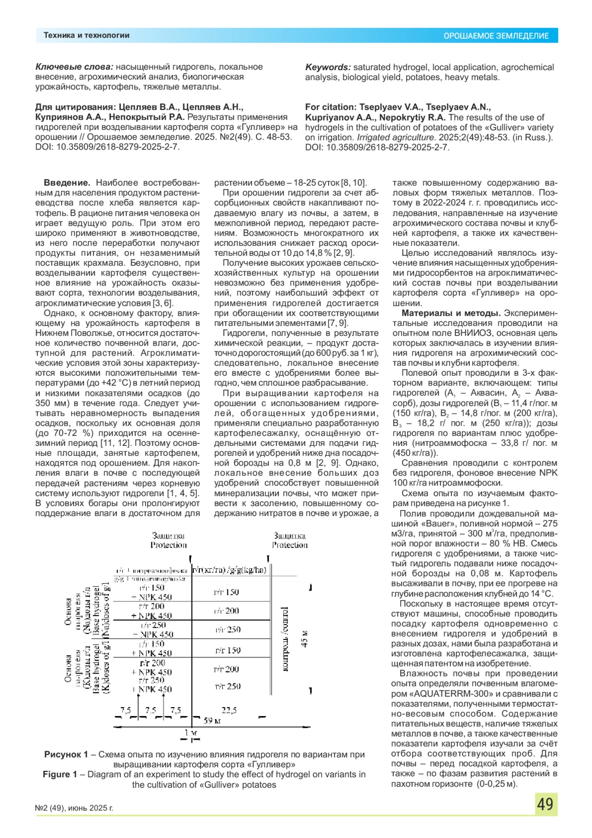 ЦЕПЛЯЕВ В. А., ЦЕПЛЯЕВ А. Н., КУПРИЯНОВ А. А., НЕПОКРЫТЫЙ Р. А. РЕЗУЛЬТАТЫ ПРИМЕНЕНИЯ ГИДРОГЕЛЕЙ ПРИ ВОЗДЕЛЫВАНИИ КАРТОФЕЛЯ СОРТА «ГУЛЛИВЕР» НА ОРОШЕНИИ // ОРОШАЕМОЕ ЗЕМЛЕДЕЛИЕ. 2025. № 2 (49)