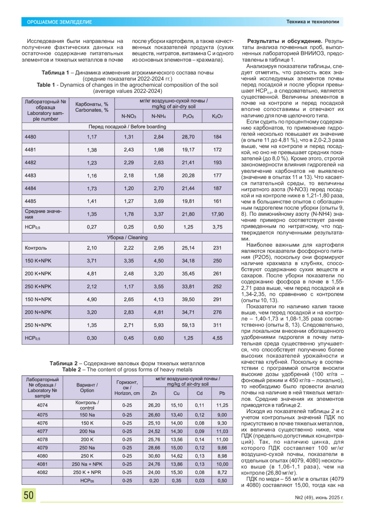 Ключевые фразы: насыщенный гидрогель, локальное внесение, агрохимический анализ, биологическая урожайность, картофель, тяжелые металлы