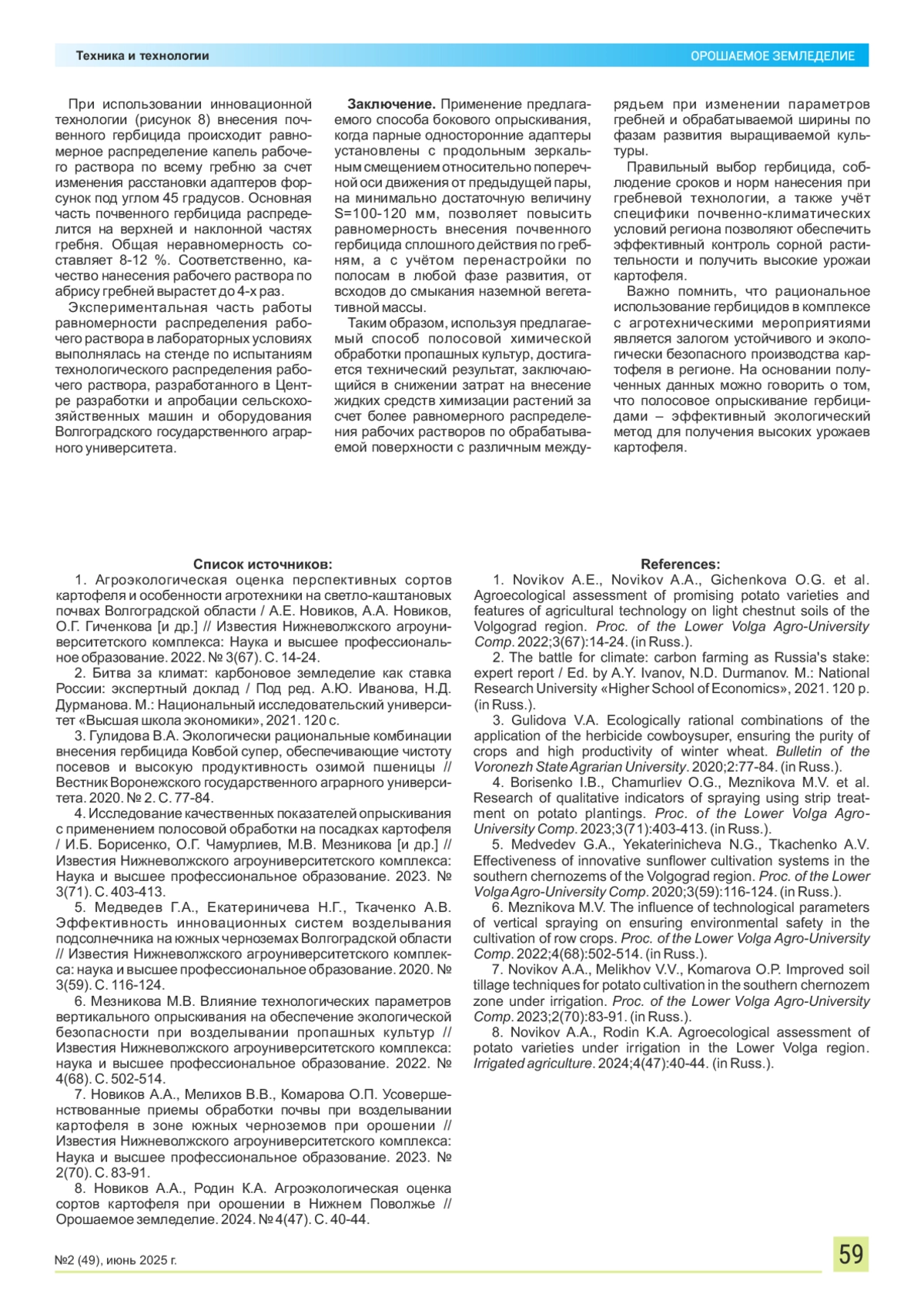 8. Новиков А.А., Родин К.А. Агроэкологическая оценка сортов картофеля при орошении в Нижнем Поволжье // Орошаемое земледелие. 2024. № 4(47). С. 40-44.
