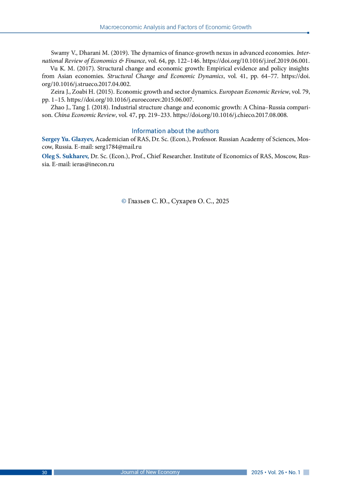 7. Глазьев С. Ю., Сухарев О. С. (2024b). Экономический рост России и структурная модернизация: проектный подход // Российский экономический журнал. № 2. С. 4-30. EDN: YETAOG
