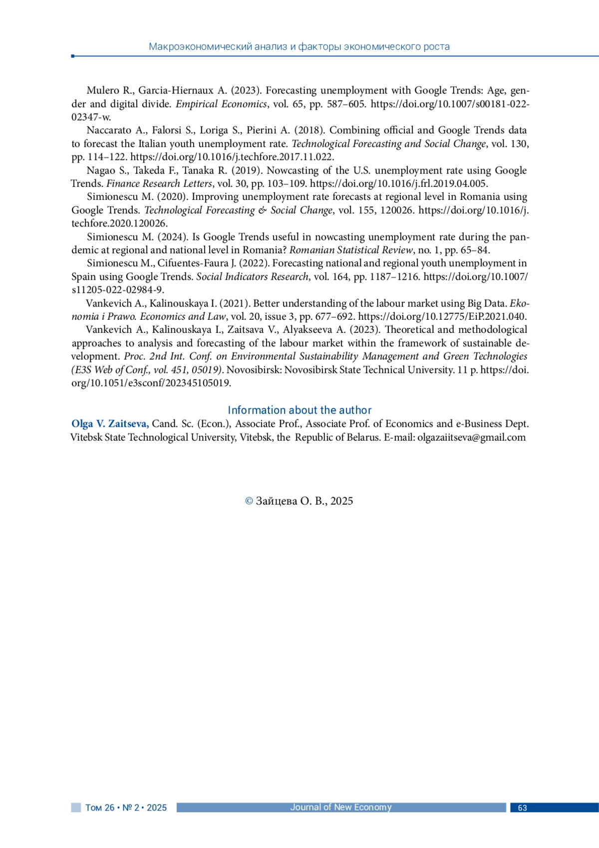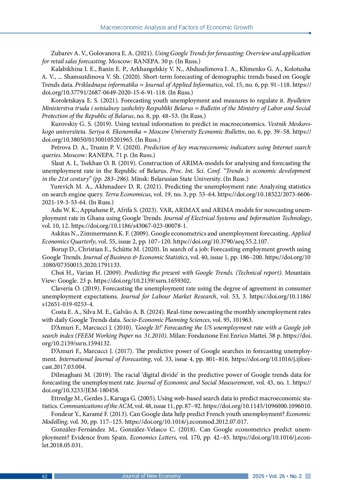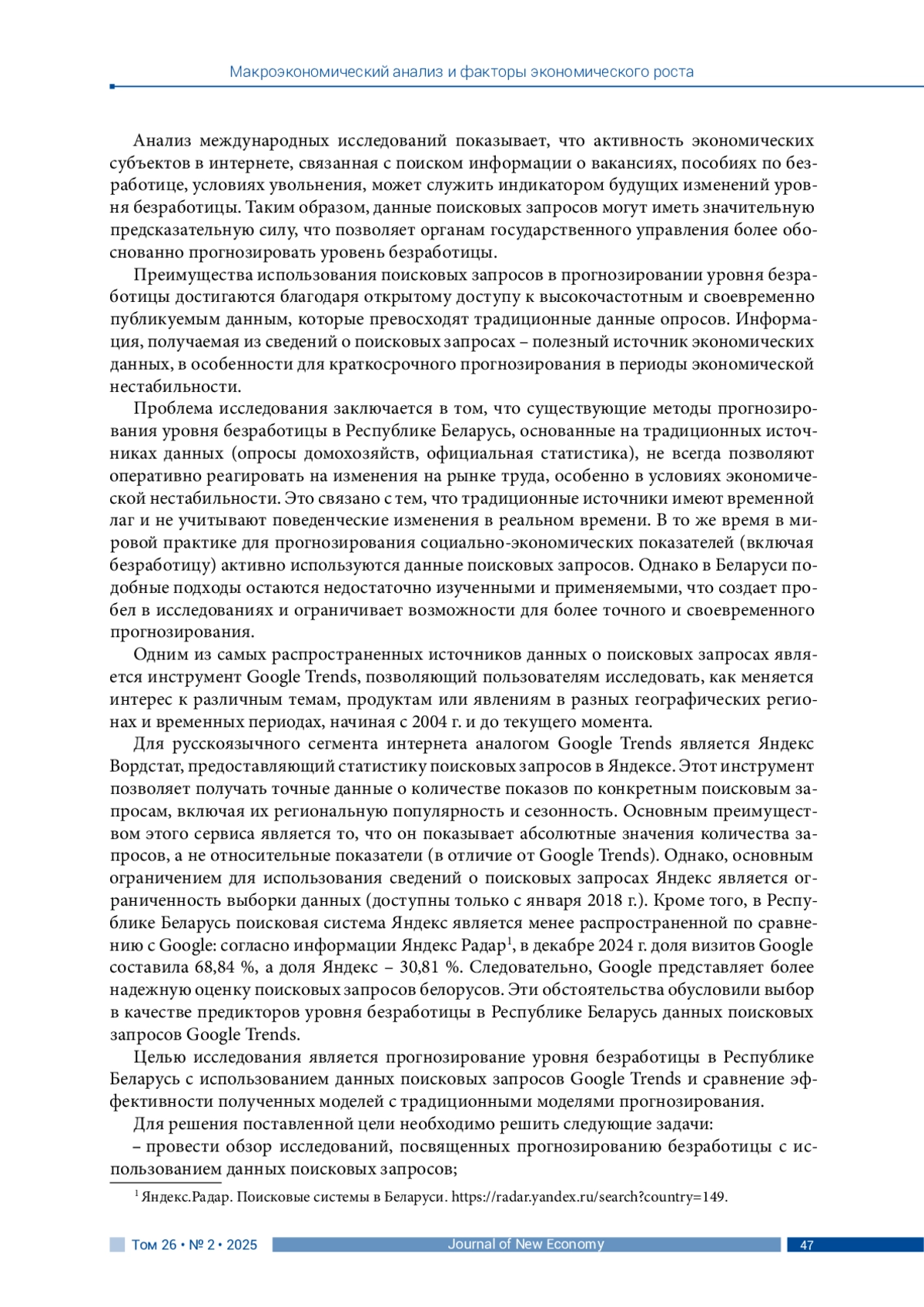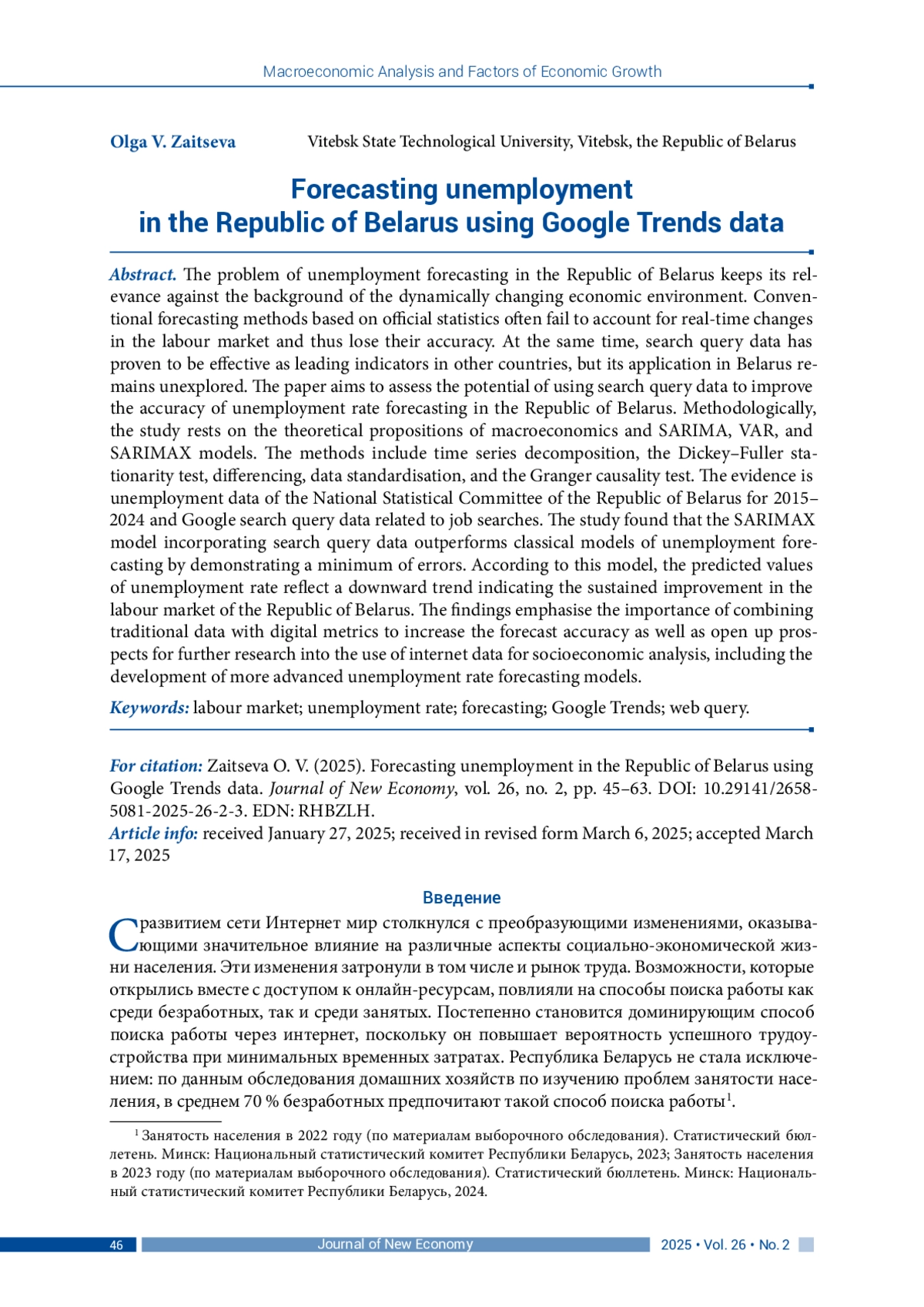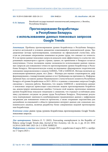 ЗАЙЦЕВА О. В. ПРОГНОЗИРОВАНИЕ БЕЗРАБОТИЦЫ В РЕСПУБЛИКЕ БЕЛАРУСЬ С ИСПОЛЬЗОВАНИЕМ ДАННЫХ ПОИСКОВЫХ ЗАПРОСОВ GOOGLE TRENDS // JOURNAL OF NEW ECONOMY. 2025. Т. 26 № 2