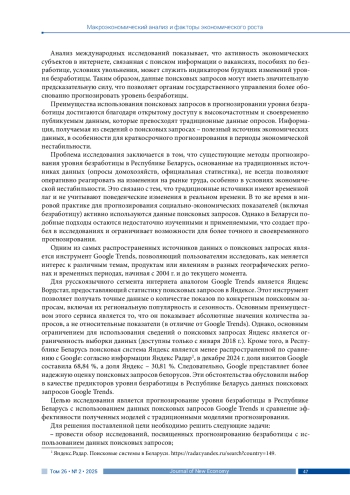 Проблема прогнозирования уровня безработицы в Республике Беларусь остается актуальной в условиях динамично изменяющейся экономической среды. Традиционные методы прогнозирования, основанные на официальной статистике, зачастую не учитывают оперативные изменения на рынке труда, что снижает их точность. В то же время данные поисковых запросов доказали свою эффективность в качестве опережающих индикаторов в других странах, однако, их применение в Беларуси остается неизученным. Статья посвящена оценке возможности использования данных поисковых запросов для повышения точности прогнозирования уровня безработицы в Республике Беларусь. Методологическую основу исследования сформировали теоретические положения макроэкономики и модели SARIMA, VAR и SARIMAX. Методы включали декомпозицию временных рядов, тест Дики – Фуллера для оценки стационарности, дифференцирование, стандартизацию данных и тест Грейнджера на причинность. Информационную базу составили данные Национального статистического комитета Республики Беларусь об уровне безработицы за 2015–2024 гг. и данные о поисковых запросах Google, связанные с поиском работы. Выявлено, что модель SARIMAX с включением данных о поисковых запросах превосходит классические модели прогнозирования безработицы, демонстрируя минимальные ошибки. Согласно этой модели, прогнозные значения уровня безработицы показали тенденцию к снижению, что отражает устойчивую динамику улучшения ситуации на рынке труда Республики Беларусь. Полученные результаты подчеркивают значимость комбинирования традиционных данных с цифровыми метриками для повышения точности прогнозов, а также открывают перспективы для дальнейших исследований в области применения интернет-данных для социально-экономического анализа, включая разработку более совершенных моделей прогнозирования безработицы
