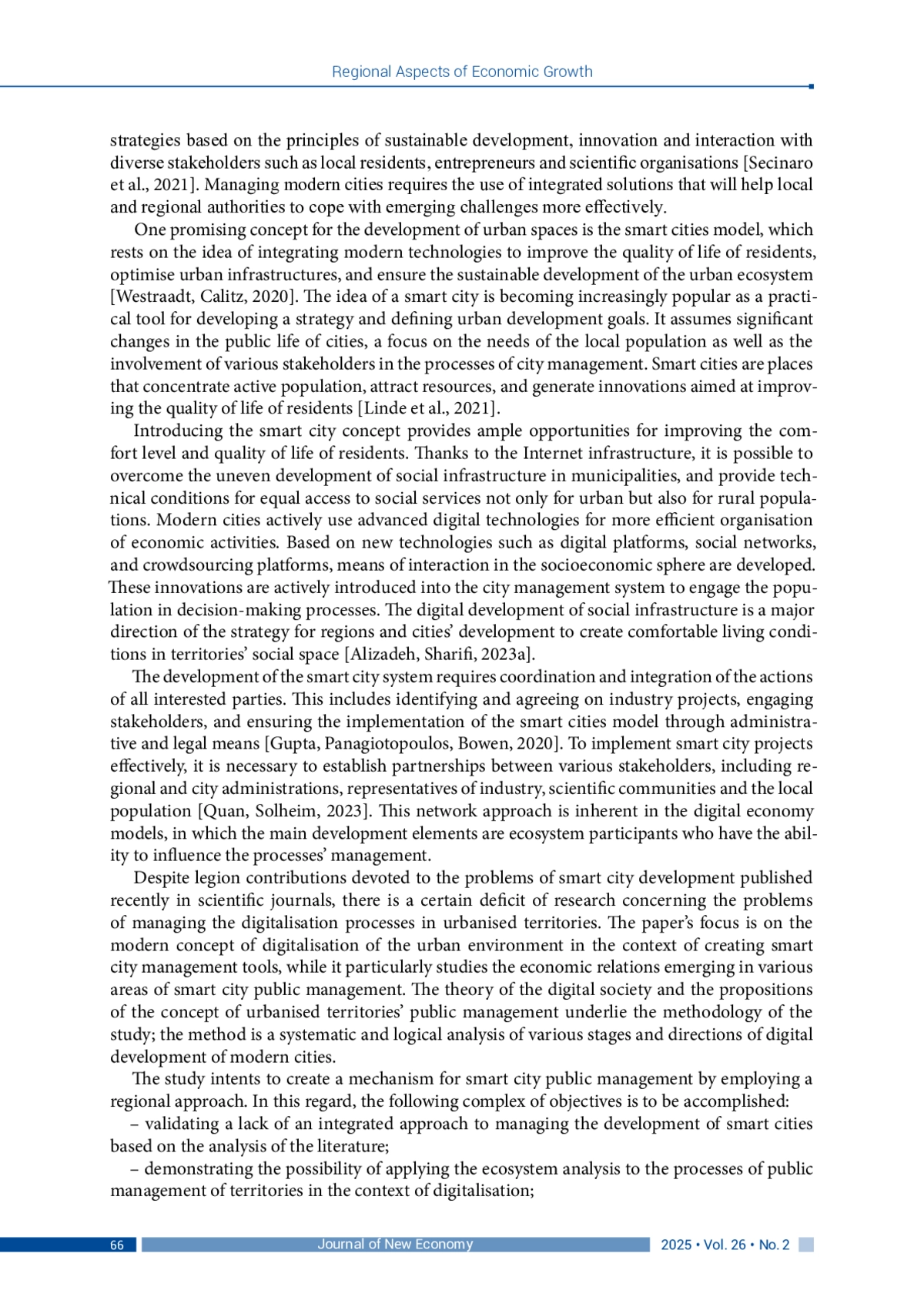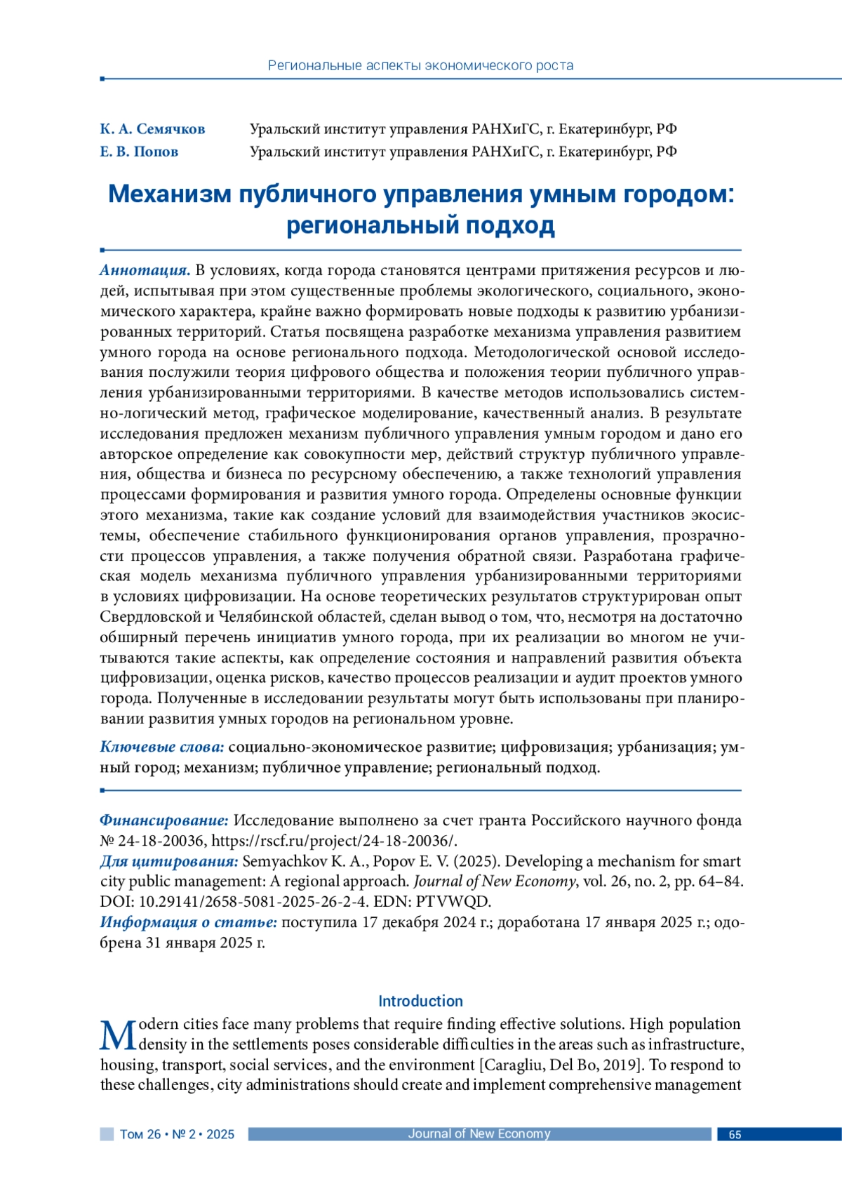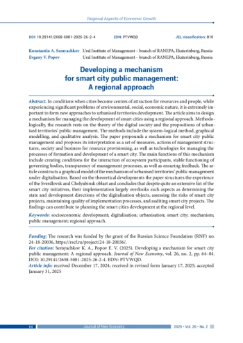 СЕМЯЧКОВ К. А., ПОПОВ Е. В. DEVELOPING A MECHANISM FOR SMART CITY PUBLIC MANAGEMENT: A REGIONAL APPROACH // JOURNAL OF NEW ECONOMY. 2025. Т. 26 № 2