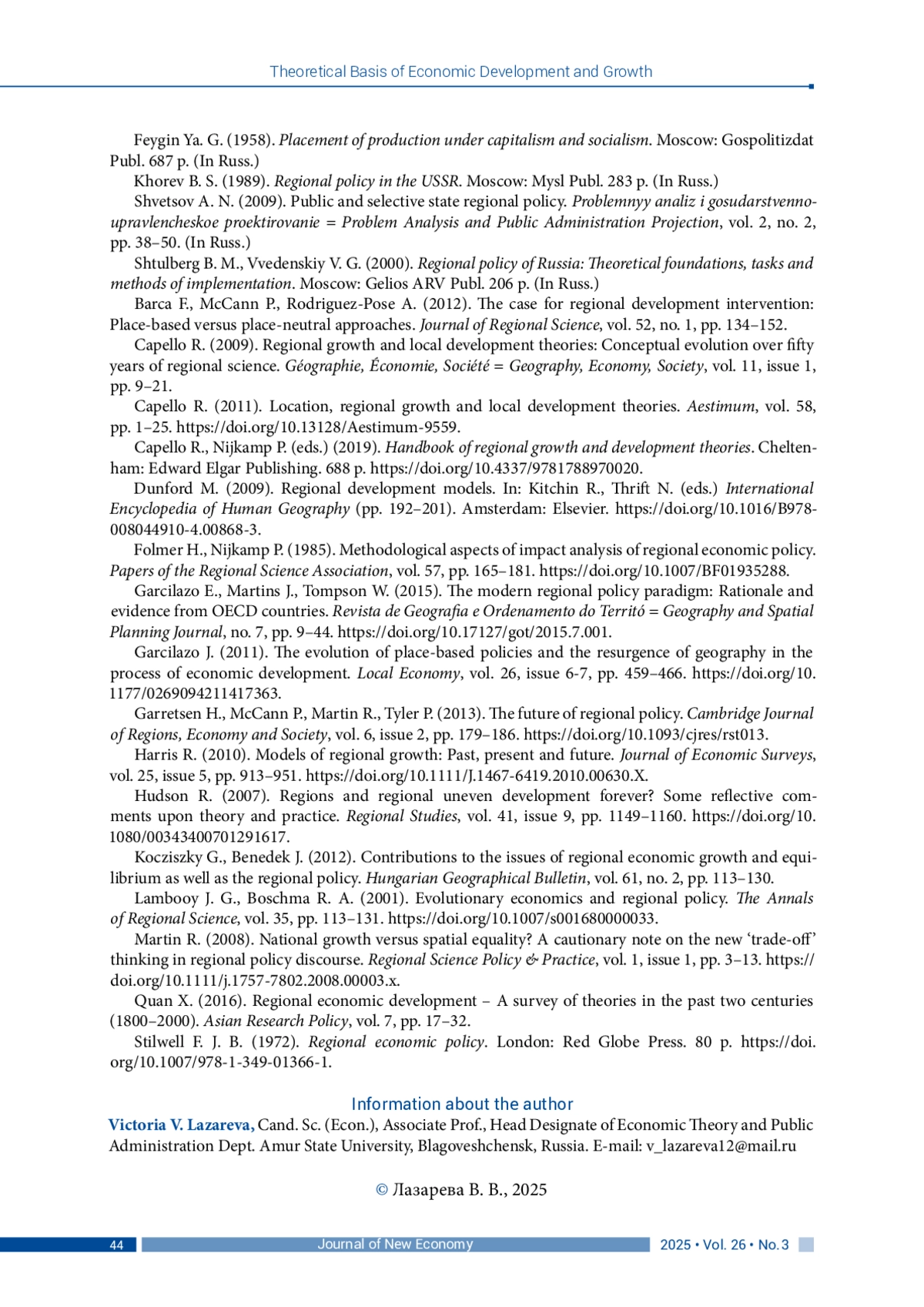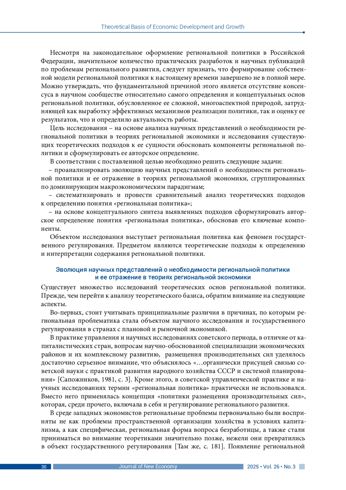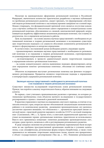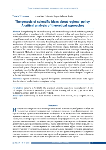 ЛАЗАРЕВА В. В. ГЕНЕЗИС НАУЧНЫХ ПРЕДСТАВЛЕНИЙ О РЕГИОНАЛЬНОЙ ПОЛИТИКЕ: КРИТИЧЕСКИЙ АНАЛИЗ ТЕОРЕТИЧЕСКИХ ПОДХОДОВ // JOURNAL OF NEW ECONOMY. 2025. Т. 26 № 3