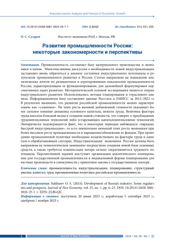 Промышленность составляет базу материального производства и экономики в целом. Многочисленные дискуссии о необходимости новой индустриализации заставляют вновь обратиться к анализу состояния индустриального потенциала и результатов промышленного развития в России. Статья направлена на подведение аналитических итогов по релевантным и агрегированным показателям промышленности России, характеризующим ее функционирование, для дальнейшей формулировки перспективных задач развития. Методологической основой исследования является теория индустриального развития. Использовались методы планирования и отраслевого анализа. Информационную базу составляют данные Росстата и ЕМИСС за 2012–2022 гг. В результате выявлено, что развитие российской промышленности можно характеризовать как «суженное». На темп роста валовой добавленной стоимости оказывает более сильное влияние динамика основного капитала, нежели труда. Величина фактора труда вносила большой вклад в создание новой стоимости, что говорит о преобладании трудоинтенсивных технологий либо устаревающих капиталоинтенсивных технологий. Эмпирически подтверждается факт, что в некоторых периодах наблюдался «парадокс быстрой индустриалиазции», то есть значительно меньший темп роста экономики при более высоком росте промышленности и наращении/обновлении ее фондов. При проведении промышленной политики необходимо воздействовать на факторы труда и капитала в обрабатывающих секторах. Индустриализация экономики России должна быть направлена на технологическое замещение посредством создания новой базы основных средств, а также требуется компенсация потерь сильно сократившегося трудового потенциала. Перспективной задачей выступает организация аналитического планирования для государственной промышленности и индикативной формы планирования для частных производств в совокупности с принятием закона о государственном секторе