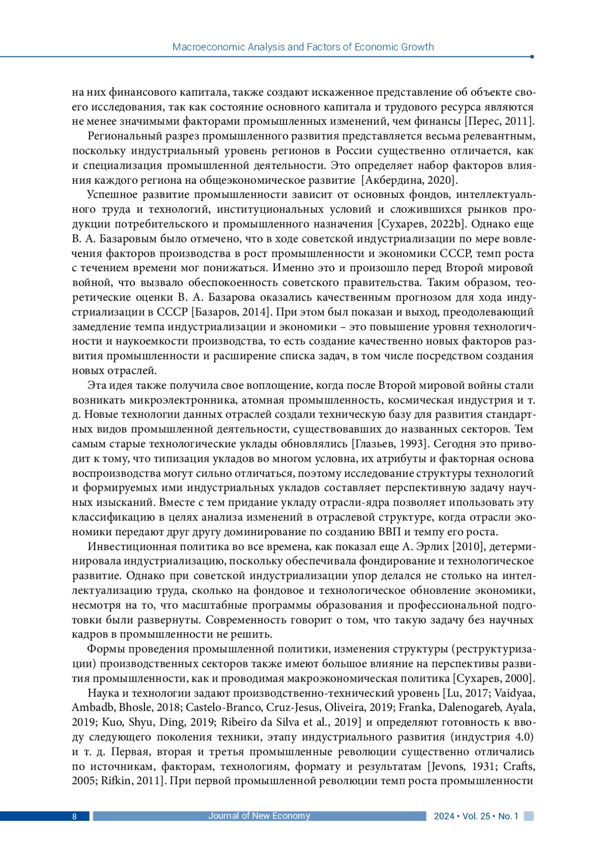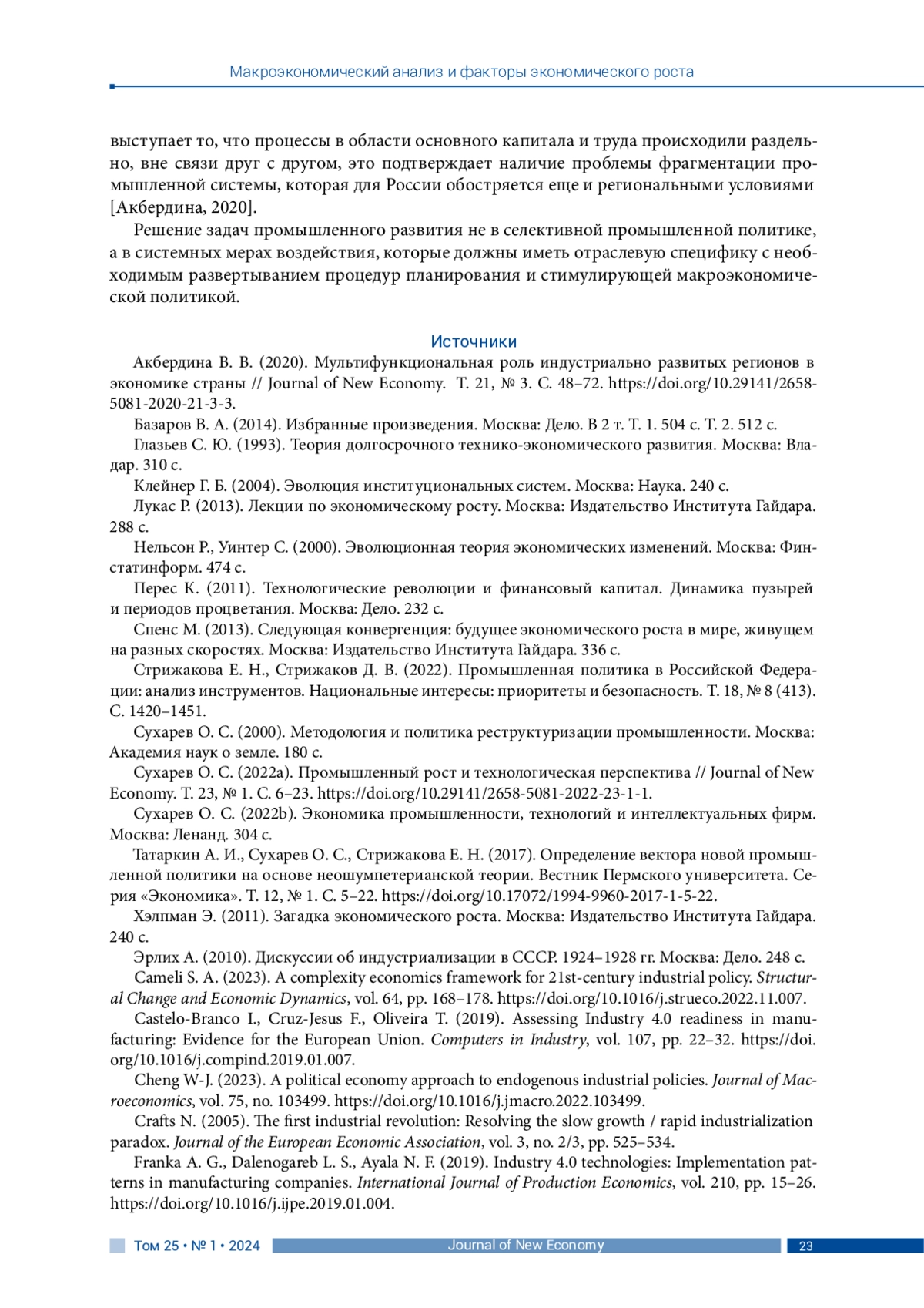 11. Сухарев О. С. (2022a). Промышленный рост и технологическая перспектива // Journal of New Economy. Т. 23, № 1. С. 6-23. DOI: 10.29141/2658-5081-2022-23-1-1 EDN: RNGFTG