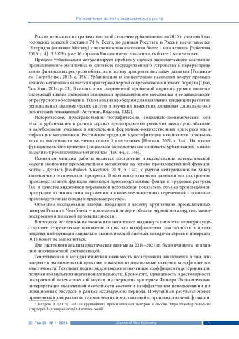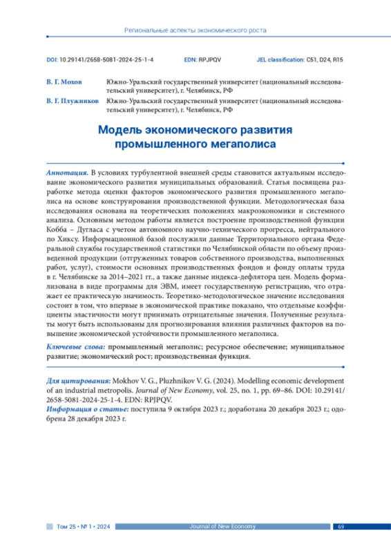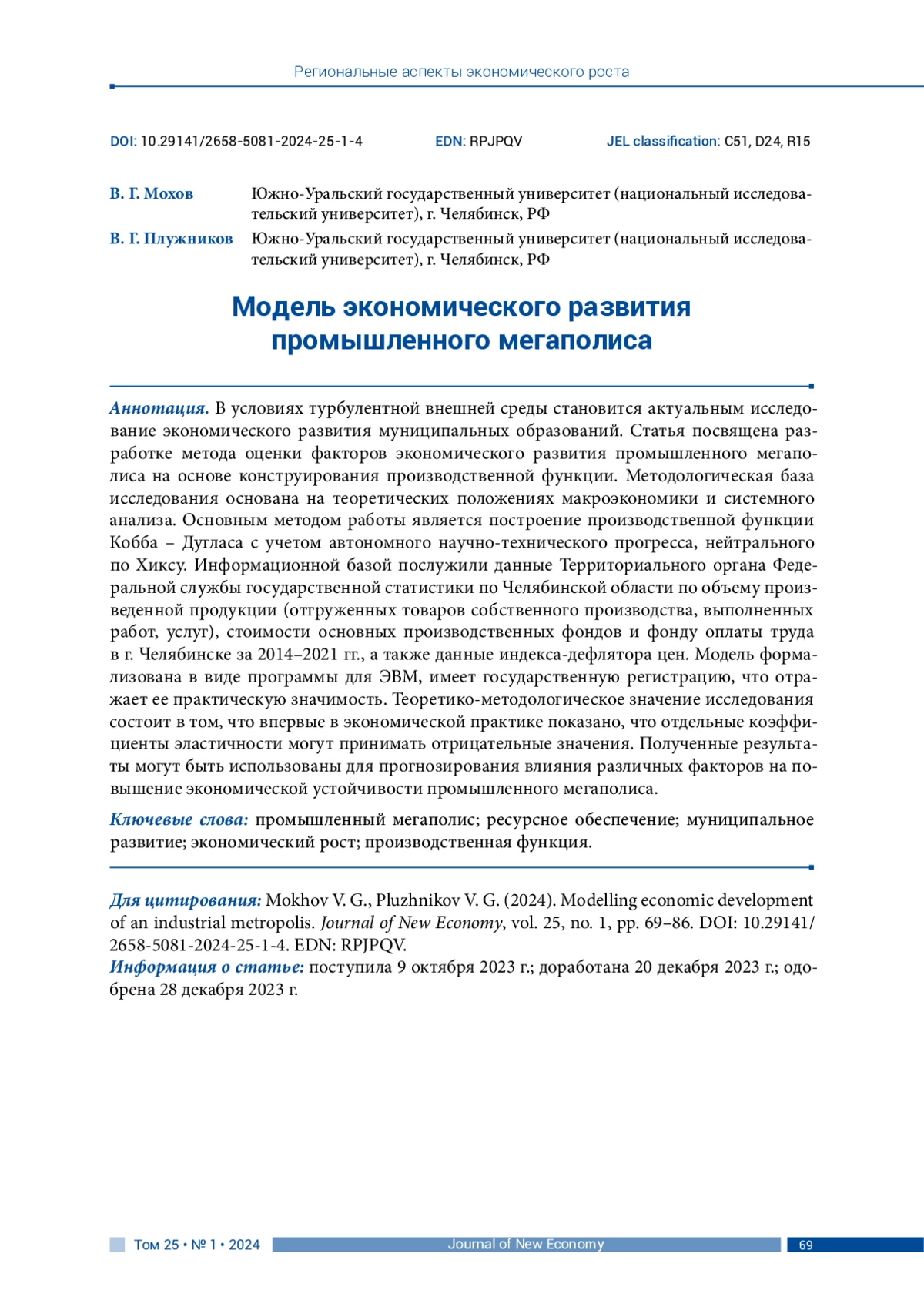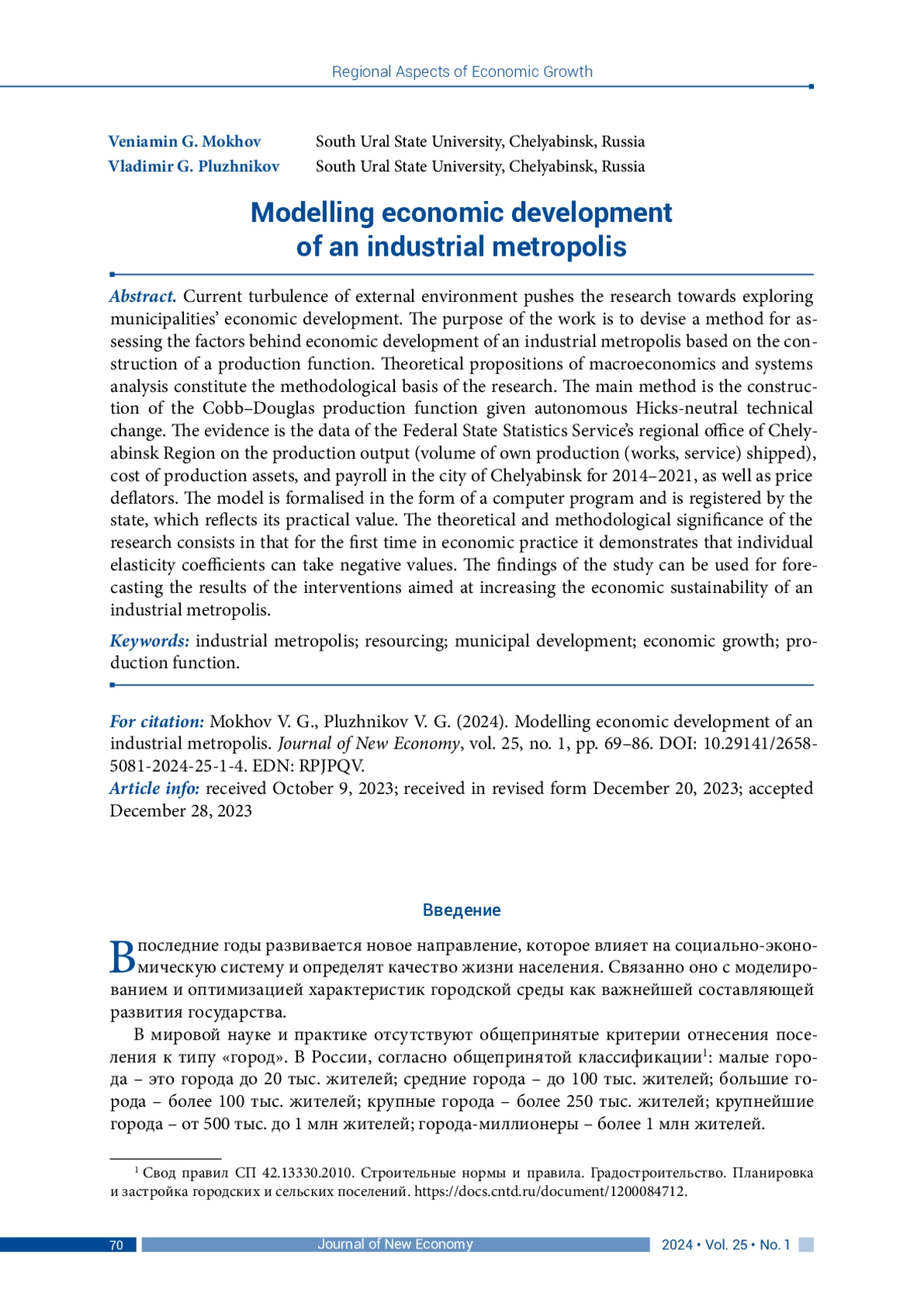 В условиях турбулентной внешней среды становится актуальным исследование экономического развития муниципальных образований. Статья посвящена разработке метода оценки факторов экономического развития промышленного мегаполиса на основе конструирования производственной функции. Методологическая база исследования основана на теоретических положениях макроэкономики и системного анализа. Основным методом работы является построение производственной функции Кобба – Дугласа с учетом автономного научно-технического прогресса, нейтрального по Хиксу. Информационной базой послужили данные Территориального органа Федеральной службы государственной статистики по Челябинской области по объему произведенной продукции (отгруженных товаров собственного производства, выполненных работ, услуг), стоимости основных производственных фондов и фонду оплаты труда в г. Челябинске за 2014–2021 гг., а также данные индекса-дефлятора цен. Модель формализована в виде программы для ЭВМ, имеет государственную регистрацию, что отражает ее практическую значимость. Теоретико-методологическое значение исследования состоит в том, что впервые в экономической практике показано, что отдельные коэффициенты эластичности могут принимать отрицательные значения. Полученные результаты могут быть использованы для прогнозирования влияния различных факторов на повышение экономической устойчивости промышленного мегаполиса