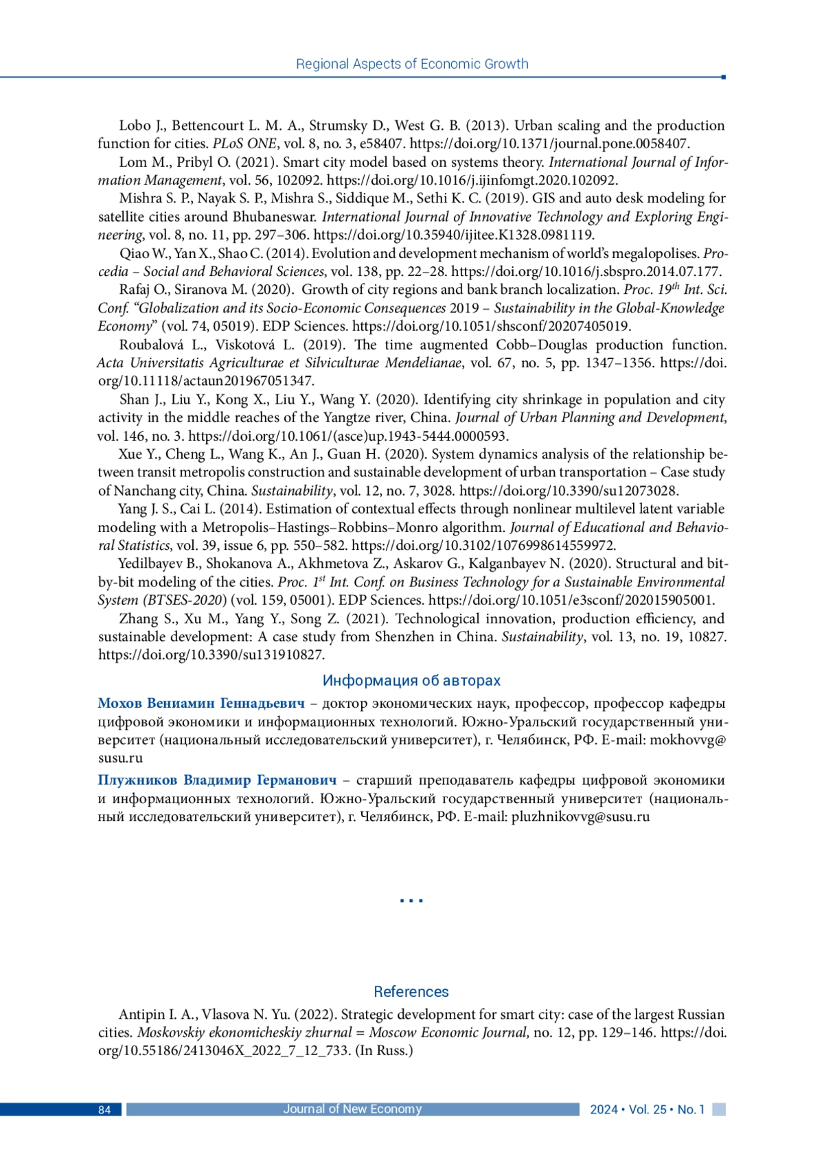 1. Антипин И. А., Власова Н. Ю. (2022). Стратегическое развитие умного города: примеры российских мегаполисов // Московский экономический журнал. № 12. C. 129-146. DOI: 10.55186/2413046X_2022_7_12_733 EDN: EHXRLA