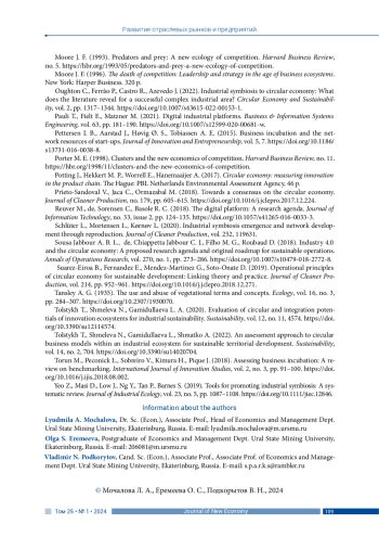 61. Tolstykh T., Shmeleva N., Gamidullaeva L., Shmatko А. (2022). An assessment approach to circular business models within an industrial ecosystem for sustainable territorial development. Sustainability, vol. 14, no. 2, 704. DOI: 10.3390/su14020704 EDN: ZDIJZW