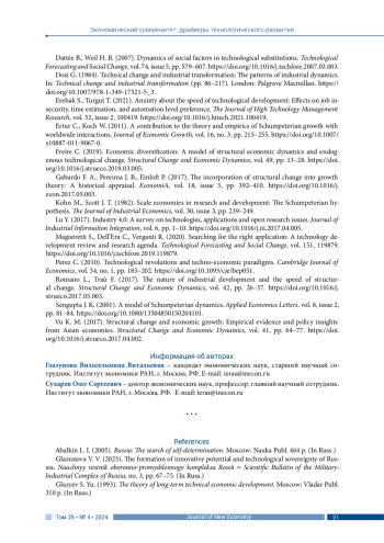 8. Сухарев О. С. (2022). Промышленный рост и технологическая перспектива // Journal of New Economy. Т. 23, № 1. С. 6-23. DOI: 10.29141/2658-5081-2022-23-1-1 EDN: RNGFTG