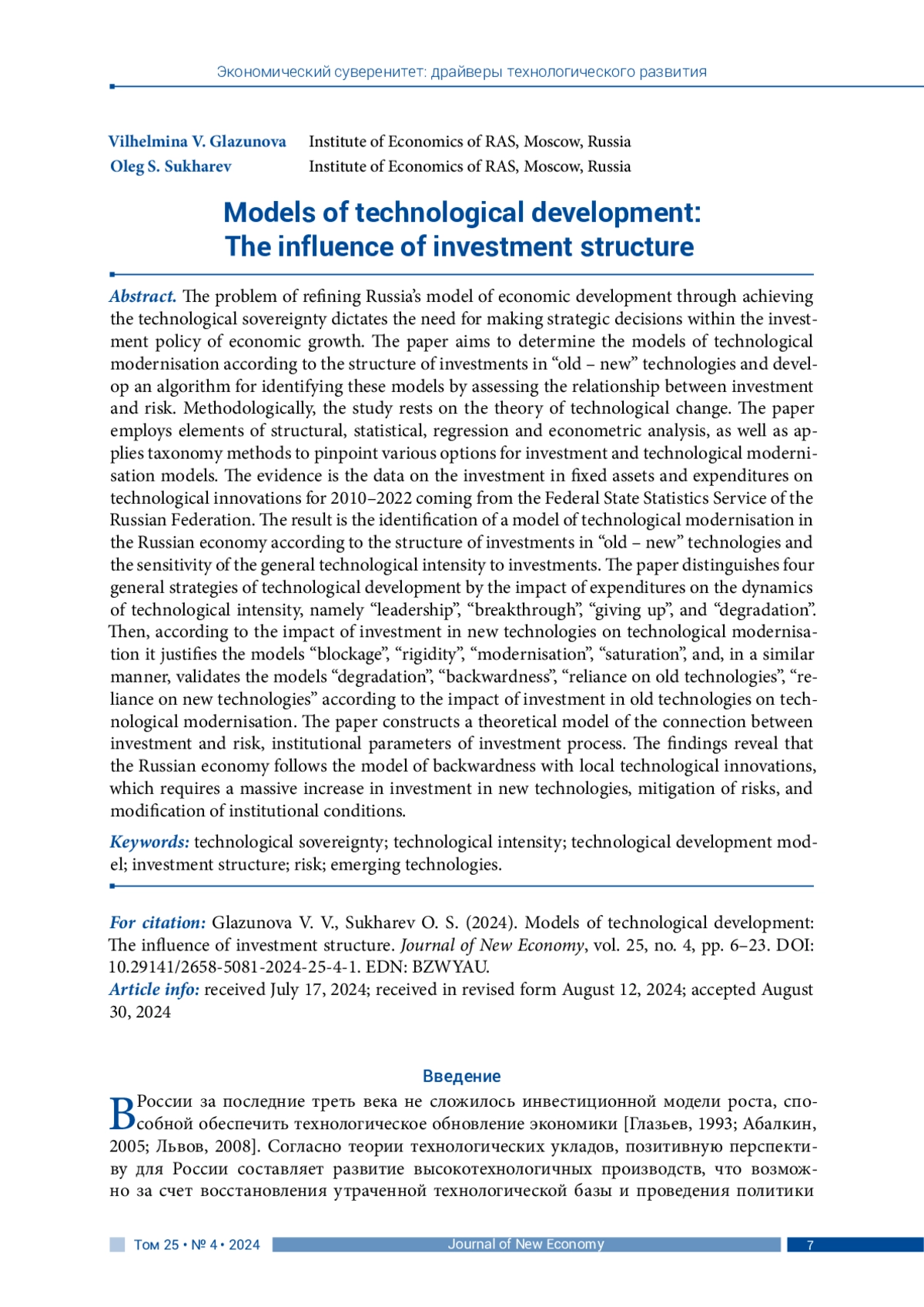 Проблема обновления модели экономического развития России на базе достижения технологического суверенитета требует выработки стратегических решений в рамках инвестиционной политики экономического роста. Статья посвящена определению моделей технологического обновления по структуре инвестиций в «старые – новые» технологии и разработке алгоритма выявления этих моделей на основе оценки связи инвестиций и риска. Методологическая база исследования представлена теорией технологических изменений. Методы включают элементы структурного, статистического, регрессионного и эконометрического анализа, а также применяются методы таксономии, позволяющие выделить различные варианты моделей инвестирования и технологического обновления. Информационную базу составили статистические данные Росстата за 2010–2022 гг., представленные показателями инвестиций в основной капитал и затратами на технологические инновации. Результатом является идентификация модели технологического обновления российской экономики по структуре инвестиций в «старые – новые» технологии и чувствительности общего показателя технологичности к инвестициям. Выделены стратегии технологического развития по влиянию расходов на динамику технологичности в виде «лидерства», «рывка», «сдачи позиций» и «деградации». По влиянию инвестиций в новые технологии на технологическое обновление обоснованы модели: «блокировки», «ригидности», «обновления» и «насыщения». Аналогичный подход реализован к инвестициям в старые технологии с выделением моделей: «деградации», «отсталости», «опоры на старые технологии», «опоры на новые технологии». Построена теоретическая модель связи инвестиций и риска, институциональных параметров процесса инвестирования. Выявлено, что российская экономика обнаруживает модель отсталости с локальными технологическими инновациями, что требует масштабного увеличения инвестиций в новые технологии, снижения рисков и модификации институциональных условий.