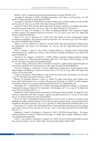 14. Acemoglu D., Restrepo P. (2020). Robots and jobs: Evidence from US labor markets. Journal of Political Economy, vol. 128, no. 6, pp. 2188-2244. DOI: 10.1086/705716 EDN: SUEWLL