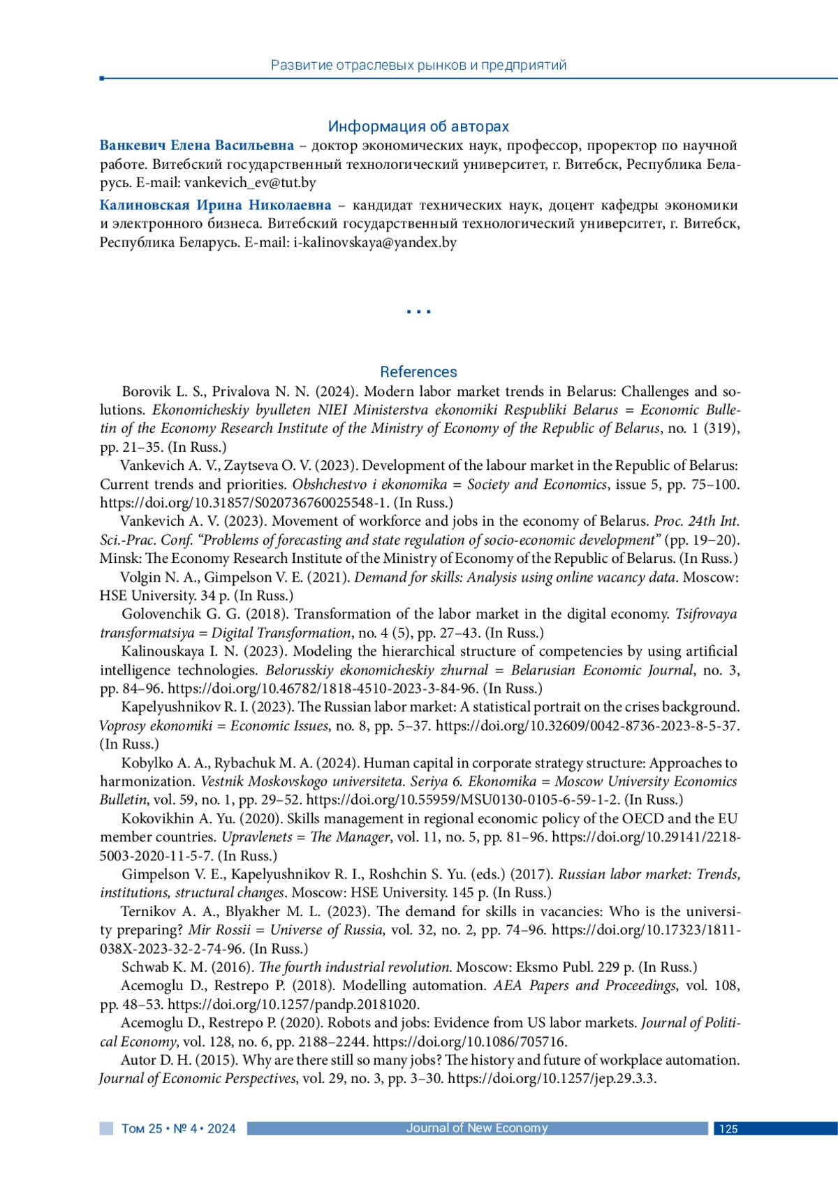 1. Боровик Л. С., Привалова Н. Н. (2024). Современные тренды рынка труда Беларуси: проблемы и пути решения // Экономический бюллетень НИЭИ Министерства экономики Республики Беларусь. № 1 (319). С. 21-35. EDN: FTVOUJ