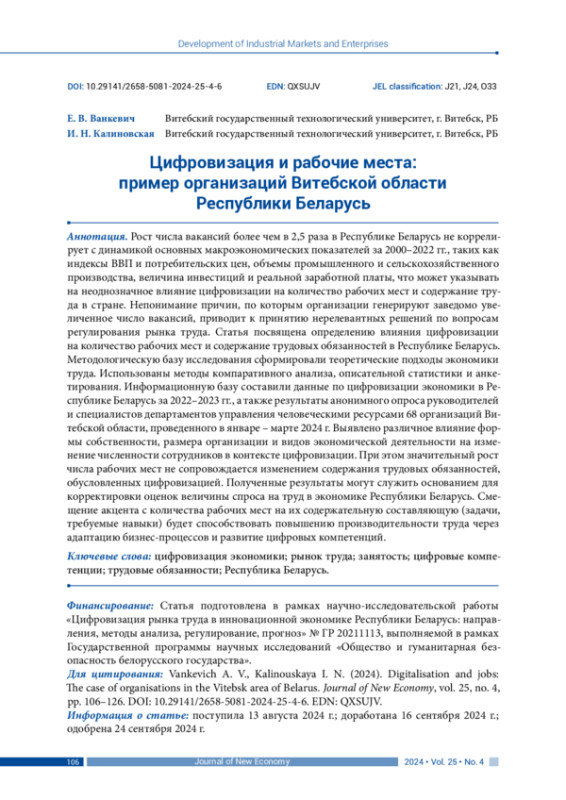 Рост числа вакансий более чем в 2,5 раза в Республике Беларусь не коррелирует с динамикой основных макроэкономических показателей за 2000–2022 гг., таких как индексы ВВП и потребительских цен, объемы промышленного и сельскохозяйственного производства, величина инвестиций и реальной заработной платы, что может указывать на неоднозначное влияние цифровизации на количество рабочих мест и содержание труда в стране. Непонимание причин, по которым организации генерируют заведомо увеличенное число вакансий, приводит к принятию нерелевантных решений по вопросам регулирования рынка труда. Статья посвящена определению влияния цифровизации на количество рабочих мест и содержание трудовых обязанностей в Республике Беларусь. Методологическую базу исследования сформировали теоретические подходы экономики труда. Использованы методы компаративного анализа, описательной статистики и анкетирования. Информационную базу составили данные по цифровизации экономики в Республике Беларусь за 2022–2023 гг., а также результаты анонимного опроса руководителей и специалистов департаментов управления человеческими ресурсами 68 организаций Витебской области, проведенного в январе – марте 2024 г. Выявлено различное влияние формы собственности, размера организации и видов экономической деятельности на изменение численности сотрудников в контексте цифровизации. При этом значительный рост числа рабочих мест не сопровождается изменением содержания трудовых обязанностей, обусловленных цифровизацией. Полученные результаты могут служить основанием для корректировки оценок величины спроса на труд в экономике Республики Беларусь. Смещение акцента с количества рабочих мест на их содержательную составляющую (задачи, требуемые навыки) будет способствовать повышению производительности труда через адаптацию бизнес-процессов и развитие цифровых компетенций