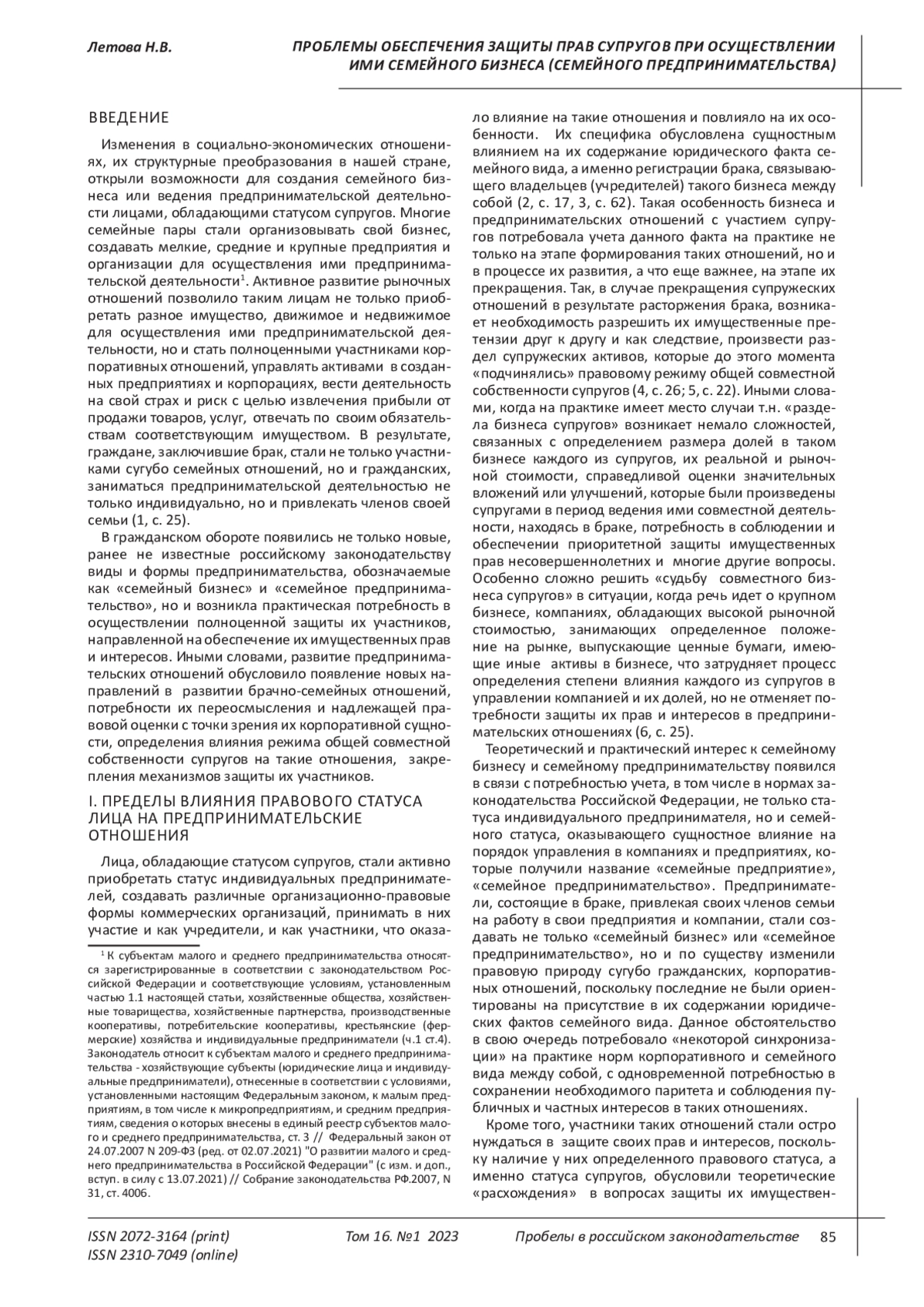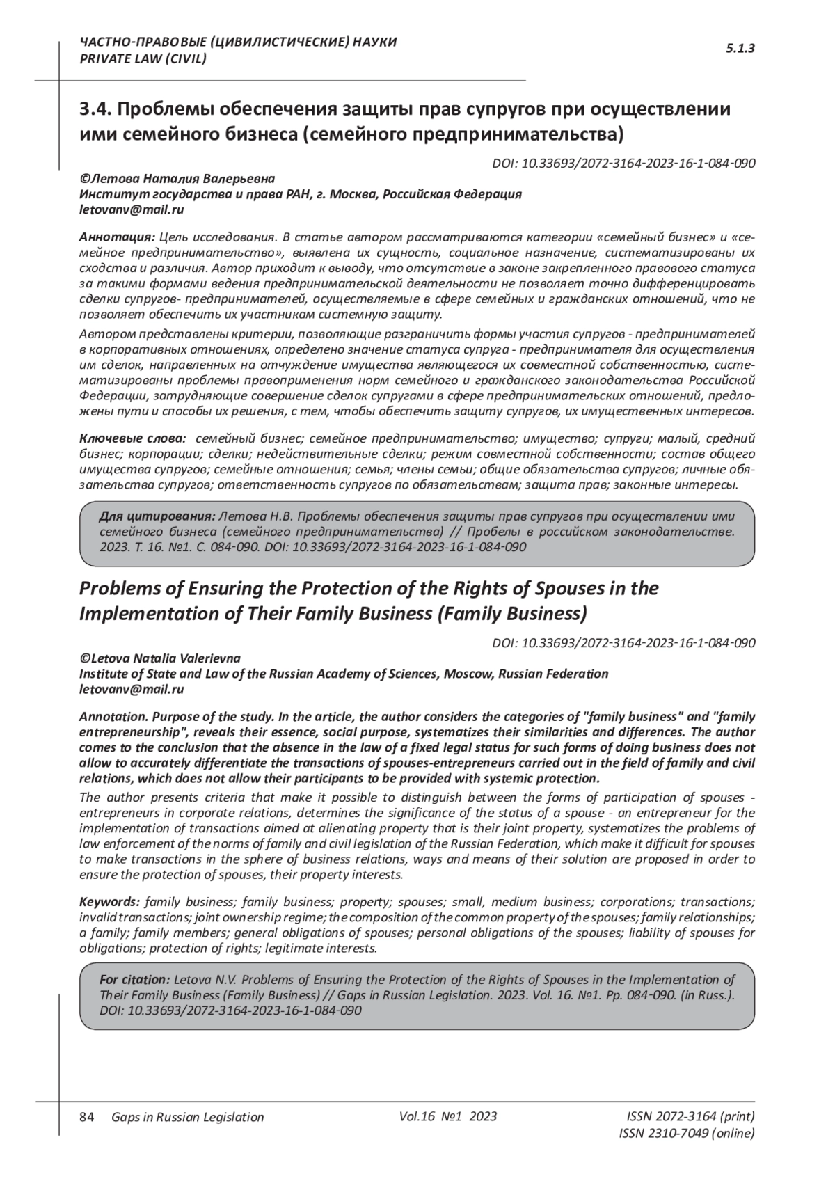 Letova N.V. Consequences of changing the marital status of spouses for business / Family business in the legal space of Russia: monograph / otv. ed. I.V. Ershova, A.N. Levushkin. Ch. 5, section 7. P. 519.