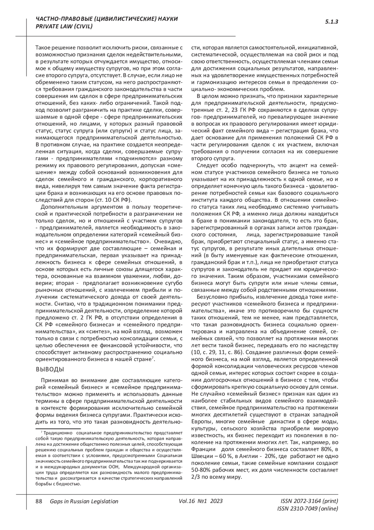 Цель исследования. В статье автором рассматриваются категории «семейный бизнес» и «семейное предпринимательство», выявлена их сущность, социальное назначение, систематизированы их сходства и различия. Автор приходит к выводу, что отсутствие в законе закрепленного правового статуса за такими формами ведения предпринимательской деятельности не позволяет точно дифференцировать сделки супругов- предпринимателей, осуществляемые в сфере семейных и гражданских отношений, что не позволяет обеспечить их участникам системную защиту. Автором представлены критерии, позволяющие разграничить формы участия супругов - предпринимателей в корпоративных отношениях, определено значение статуса супруга - предпринимателя для осуществления им сделок, направленных на отчуждение имущества являющегося их совместной собственностью, систематизированы проблемы правоприменения норм семейного и гражданского законодательства Российской Федерации, затрудняющие совершение сделок супругами в сфере предпринимательских отношений, предложены пути и способы их решения, с тем, чтобы обеспечить защиту супругов, их имущественных интересов.