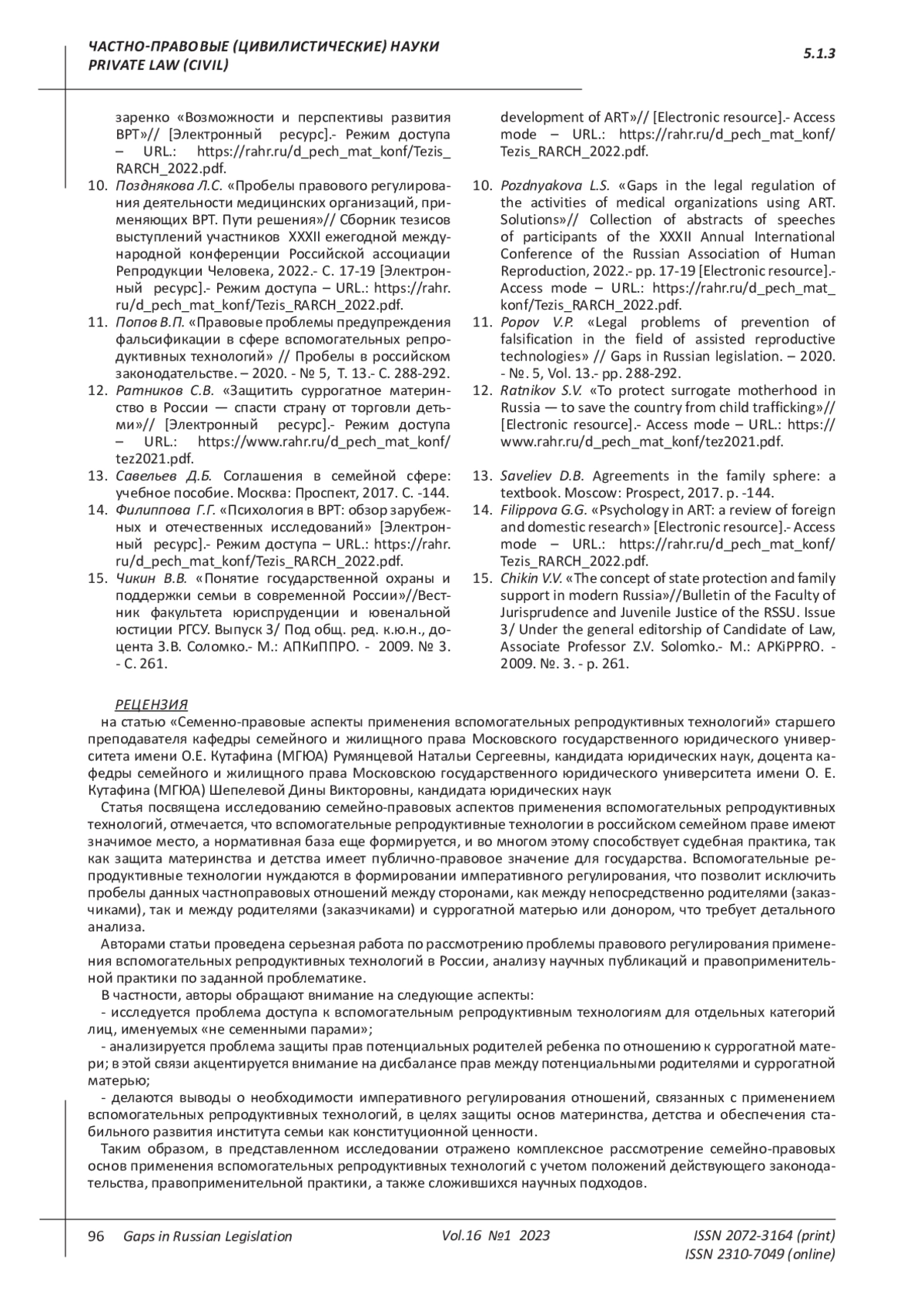 11. Попов В.П. “Правовые проблемы предупреждения фальсификации в сфере вспомогательных репродуктивных технологий” // Пробелы в российском законодательстве. - 2020. - № 5, Т. 13.- С. 288-292. EDN: VNKKXF