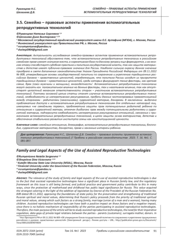Актуальность исследования семейно-правовых аспектов применения вспомогательных репродуктивных технологий обусловлена тем, что вспомогательные репродуктивные технологии в российском семейном праве имеют значимое место, а нормативная база по данному вопросу еще формируется, и во многом этому способствует судебная практика и политика государственной власти, так как защита материнства и детства имеет публично-правовое значение для России. Наиболее сильную окраску данное значение приобрело в свете дополнения законодательства Указом Президента Российской Федерации от 09.11.2022 № 809, утверждающим основы государственной политики по сохранению и укреплению традиционных российских духовно - нравственных ценностей, определяющим, что политика России исходит из приоритета традиционных духовно - нравственных ценностей, среди которых фигурируют такие факторы, как крепкая семья, брак (союз мужчины и женщины), многодетность1. Вспомогательные репродуктивные технологии могут оказать как положительное влияние на данные факторы, так и негативное влияние, так как отсутствует целостный механизм ответственности сторон - участников вспомогательных репродуктивных технологий. Поэтому основной целью статьи станет изучение вспомогательных репродуктивных технологий, необходимости их императивного регулирования, пробелы данных частноправовых правоотношений между сторонами - родителями (заказчиками), суррогатной материю, донорами. В заключении выделена проблематика доступа к вспомогательным репродуктивным технологиям для отдельных категорий лиц, именуемых «не семейными парами», проблематика защиты прав потенциальных родителей ребенка по отношению к суррогатной матери, отмечен дисбаланс прав между потенциальными родителями и суррогатной матерью, подчеркнута необходимость императивного регулирования отношений, связанных с применением вспомогательных репродуктивных технологий, в целях защиты основ материнства, детства и обеспечения стабильного развития института семьи как конституционной ценности.