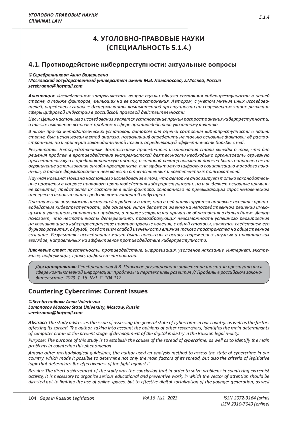 20. Белоцеркович Д. В. Сущность киберэкстремизма и его место в системе противодействия экстремистской деятельности / Д. В. Белоцеркович, А. В. Елина // Современное право. - 2022. - № 3. - С. 106-111. DOI: 10.25799/NI.2022.84.73.019 EDN: EINFJK