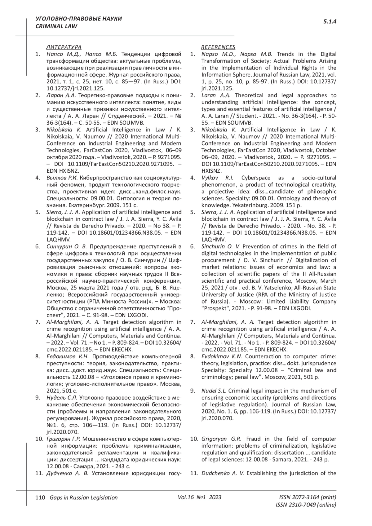 1. Напсо М.Д., Напсо М.Б. Тенденции цифровой трансформации общества: актуальные проблемы, возникающие при реализации прав личности в информационной сфере. Журнал российского права, 2021, т. 1, с. 25, нет. 10, с. 85-97. (In Russ.). DOI: 10.12737/jrl.2021.125 EDN: HYSUSZ