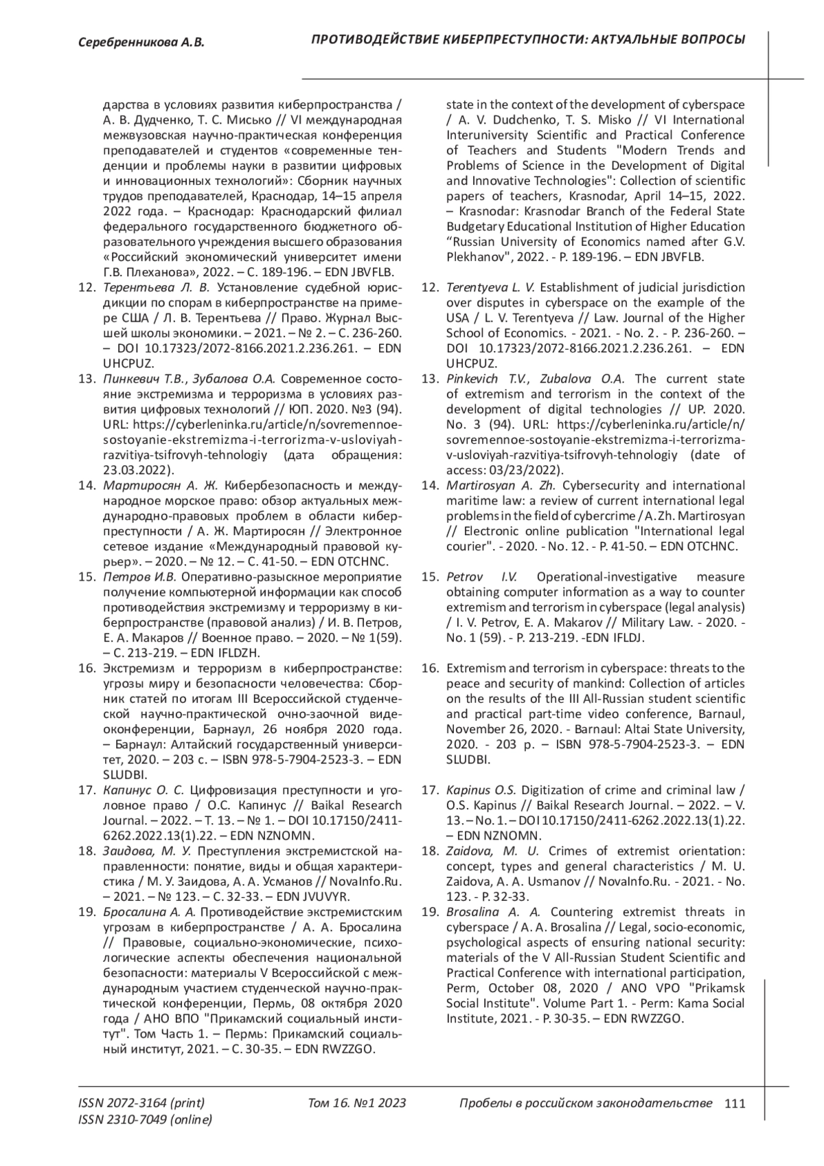Extremism and terrorism in cyberspace: threats to the peace and security of mankind: Collection of articles on the results of the III All-Russian student scientific and practical part-time video conference, Barnaul, November 26, 2020. - Barnaul: Altai State University, 2020. - 203 p. ISBN: 978-5-7904-2523-3 EDN: SLUDBI