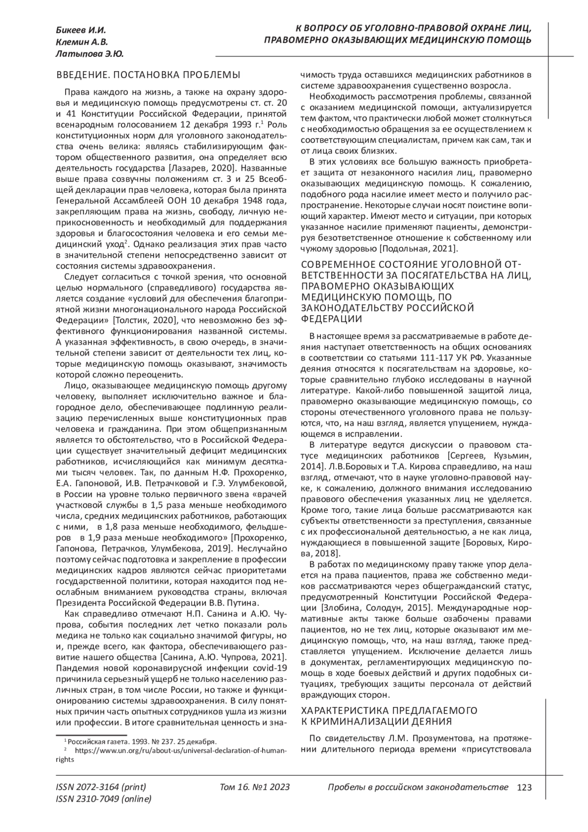 Bikeev I.I., Latypova E.Yu. On the need to criminalize violence against persons providing medical care // Materials of the XVII International Scientific and Practical Conference “Criminal Law: development strategy in the XXI century”. Moscow, 2020: Publishing House: RG-Press. pp. 183-186. EDN: IKSEIR