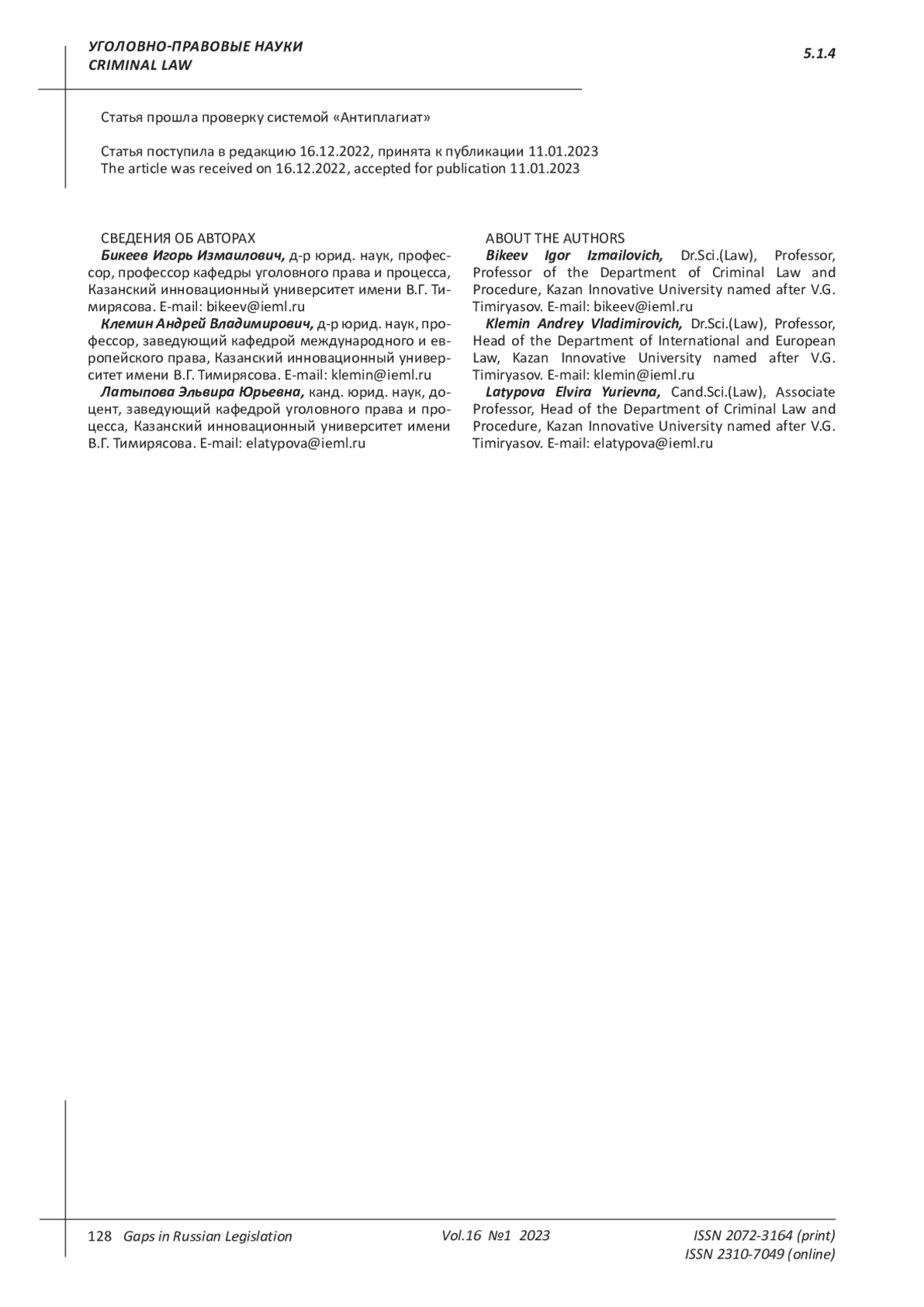 1. Бикеев И.И., Латыпова Э.Ю. О необходимости криминализации насилия в отношении лиц, осуществляющих медицинскую помощь // Материалы XVII Международной научно-практической конференции “Уголовное право: стратегия развития в XXI веке”. Москва, 2020: Издательство: РГ-Пресс. С. 183-186. EDN: IKSEIR