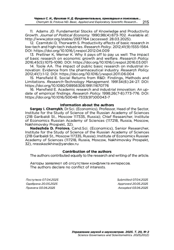 12. Czarnitzki D, Thorwarth S. Productivity effects of basic research in low-tech and high-tech industries // Research Policy. 2012. Vol. 41, Issue 9, P. 1555-1564,. DOI: 10.1016/j.respol.2012.04.009