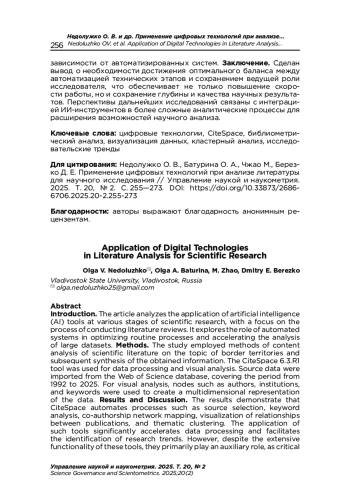 Результаты и дискуссия. Показано, что использование CiteSpace позволяет автоматизировать процессы отбора источников, анализа ключевых терминов, построения сетевых карт соавторства, визуализации взаимосвязей между публикациями и кластеризации тематических направлений. Применение подобных инструментов значительно ускоряет обработку данных и облегчает выявление исследовательских трендов. Однако, несмотря на широкий функционал, ИИ-инструменты выполняют преимущественно вспомогательную роль, поскольку критическая интерпретация данных, формулирование гипотез, выводов и положений научной новизны остаются задачами исследователя. Отмечены потенциальные риски, связанные с возможными ошибками в интерпретации данных и снижением критического подхода при чрезмерной зависимости от автоматизированных систем.