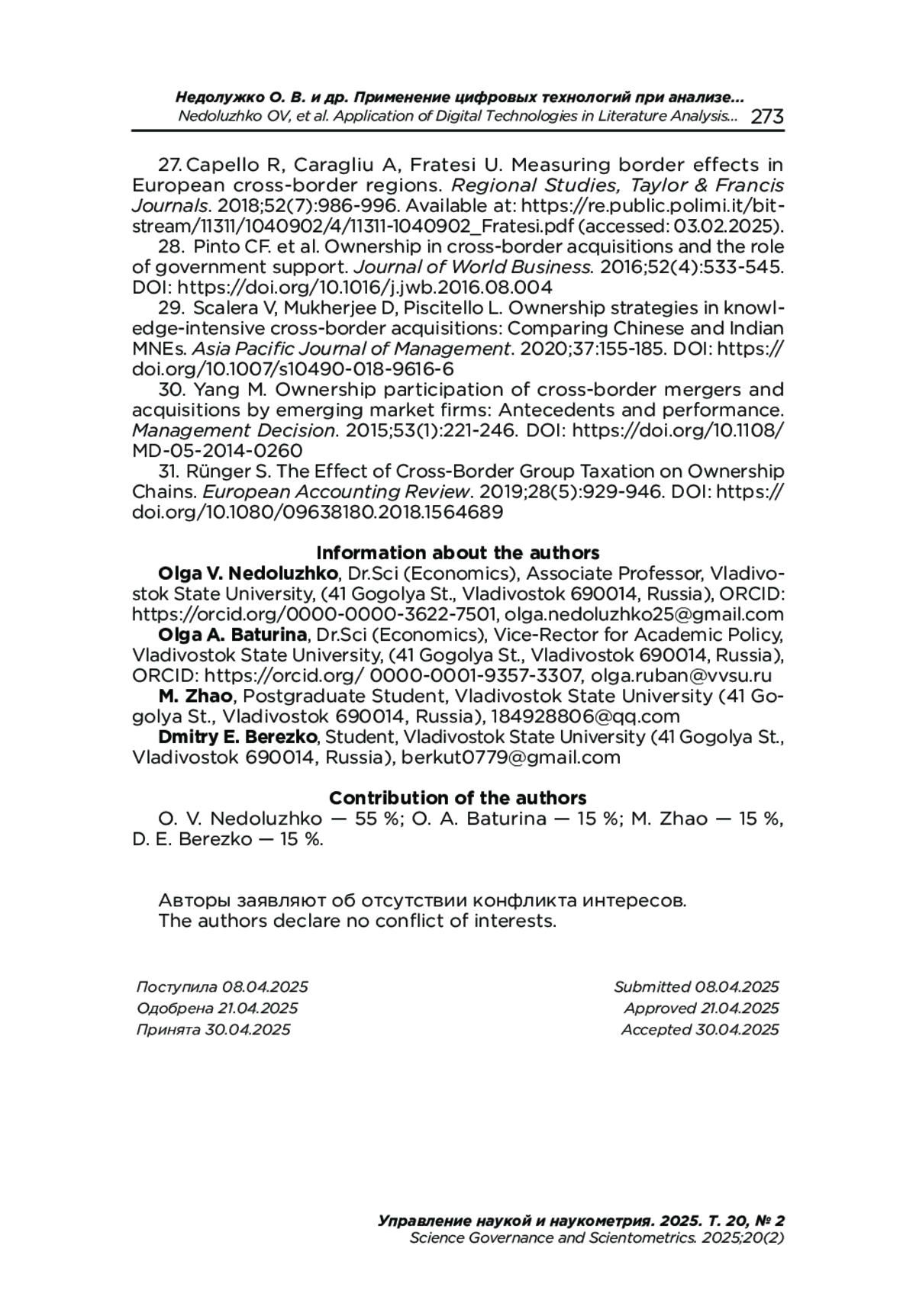 28. Pinto C. F. et al. Ownership in cross-border acquisitions and the role of government support // Journal of World Business. 2016. Vol. 52, iss. 4. P. 533-545. DOI: 10.1016/j.jwb.2016.08.004