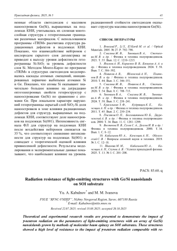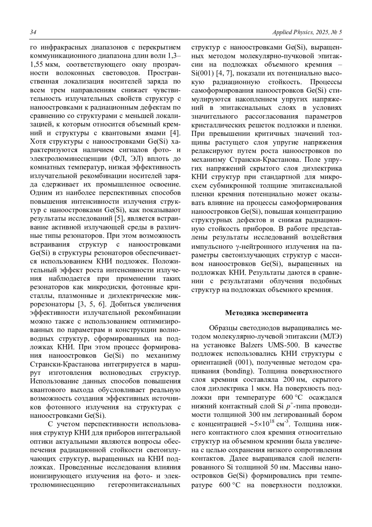 КАБАЛЬНОВ Ю. А., ИВАНОВА М. М. РАДИАЦИОННАЯ СТОЙКОСТЬ СВЕТОИЗЛУЧАЮЩИХ СТРУКТУР С НАНООСТРОВКАМИ GE(SI) НА ПОДЛОЖКАХ «КРЕМНИЙ НА ИЗОЛЯТОРЕ» // ПРИКЛАДНАЯ ФИЗИКА. 2025. №5