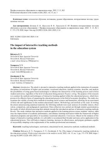 3. Турчина Ж. Е., Бакшеев А. И., Бакшеева С. Л., Шарова О. Я., Нор О. В. Интерактивные методы обучения в системе высшей школы // Современное педагогическое образование. 2022. № 4. URL: https://cyberleninka.ru/article/n/interaktivnye-metody-obucheniya-v-sisteme-vysshey-shkoly (дата обращения: 23.12.2024).
