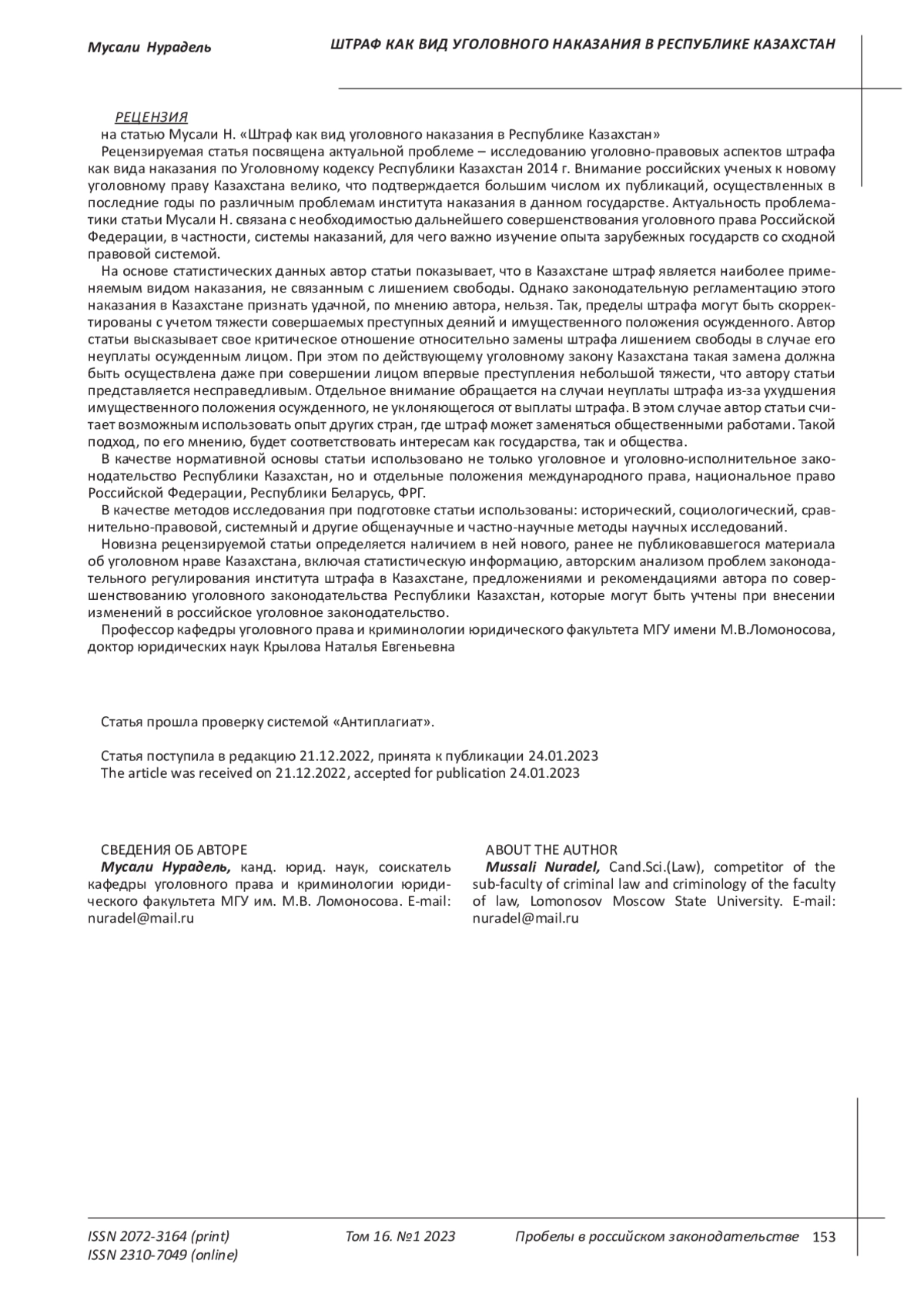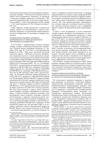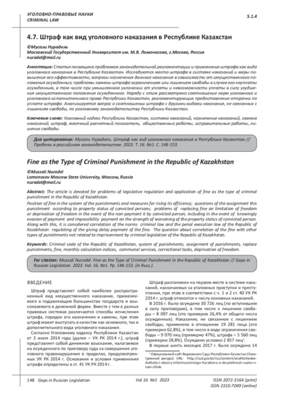 МУСАЛИ Н. ШТРАФ КАК ВИД УГОЛОВНОГО НАКАЗАНИЯ В РЕСПУБЛИКЕ КАЗАХСТАН // ПРОБЕЛЫ В РОССИЙСКОМ ЗАКОНОДАТЕЛЬСТВЕ. 2023. Т. 16 № 1