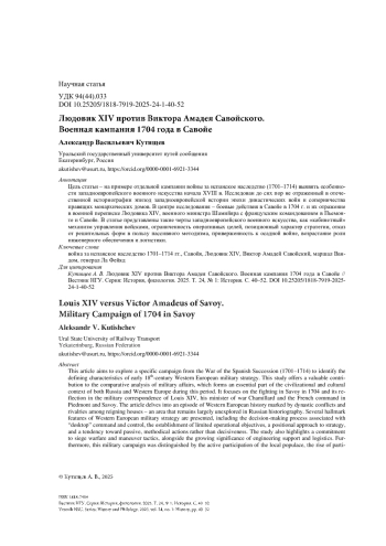 Цель статьи – на примере отдельной кампании войны за испанское наследство (1701–1714) выявить особенности западноевропейского военного искусства начала XVIII в. Исследован до сих пор не отраженный в отечественной историографии эпизод западноевропейской истории эпохи династических войн и соперничества правящих монархических домов. В центре исследования – боевые действия в Савойе в 1704 г. и их отражение в военной переписке Людовика XIV, военного министра Шамийяра с французским командованием в Пьемонте и Савойе. В статье представлены такие черты западноевропейского военного искусства, как «кабинетный» механизм управления войсками, ограниченность оперативных целей, позиционный характер стратегии, отказ от решительных форм в пользу пассивного методизма, приверженность к осадной войне, возрастание роли инженерного обеспечения и логистики.