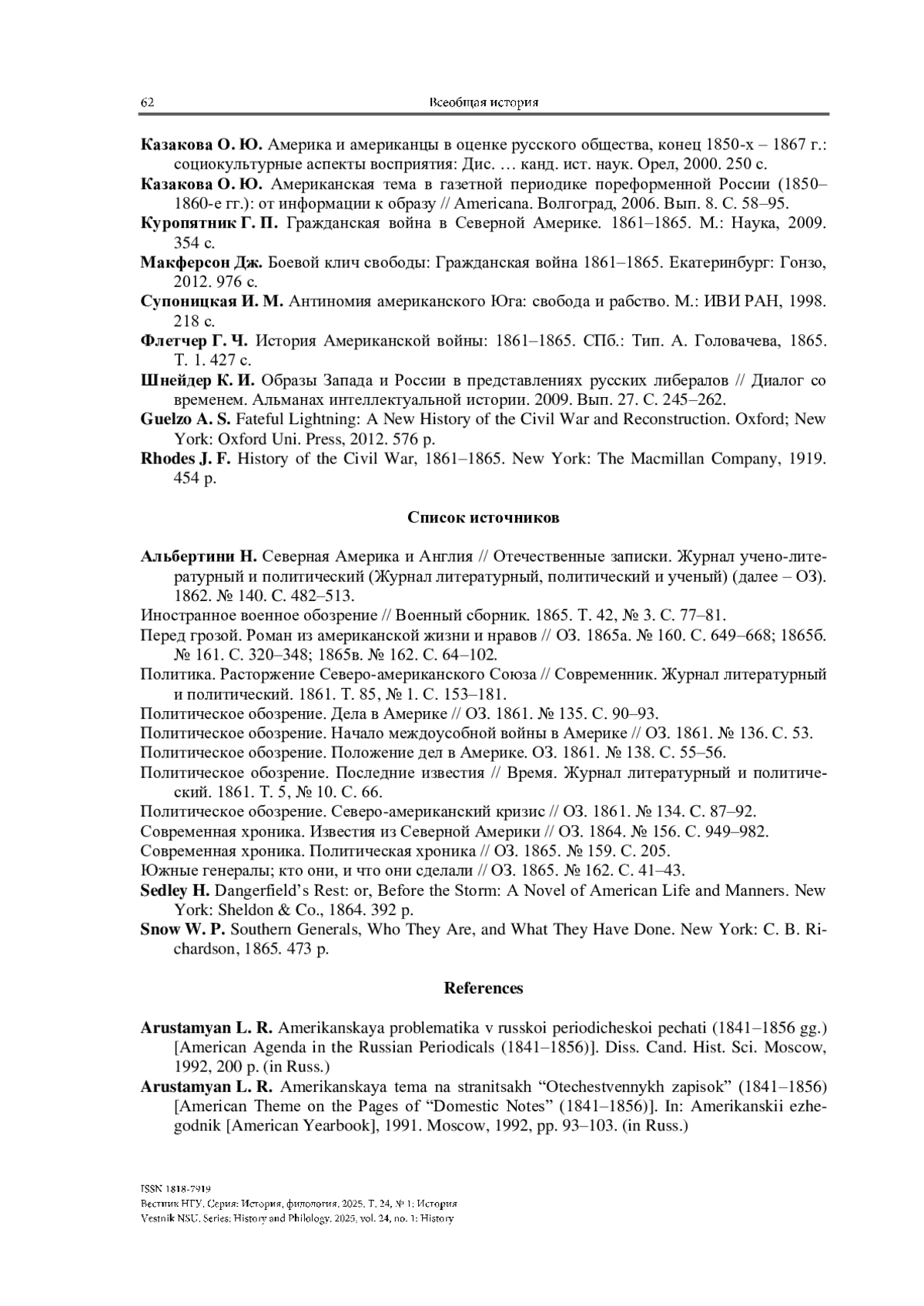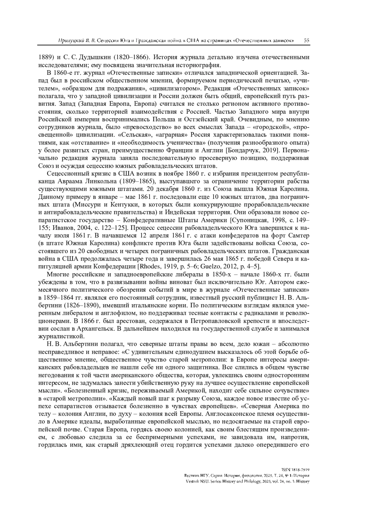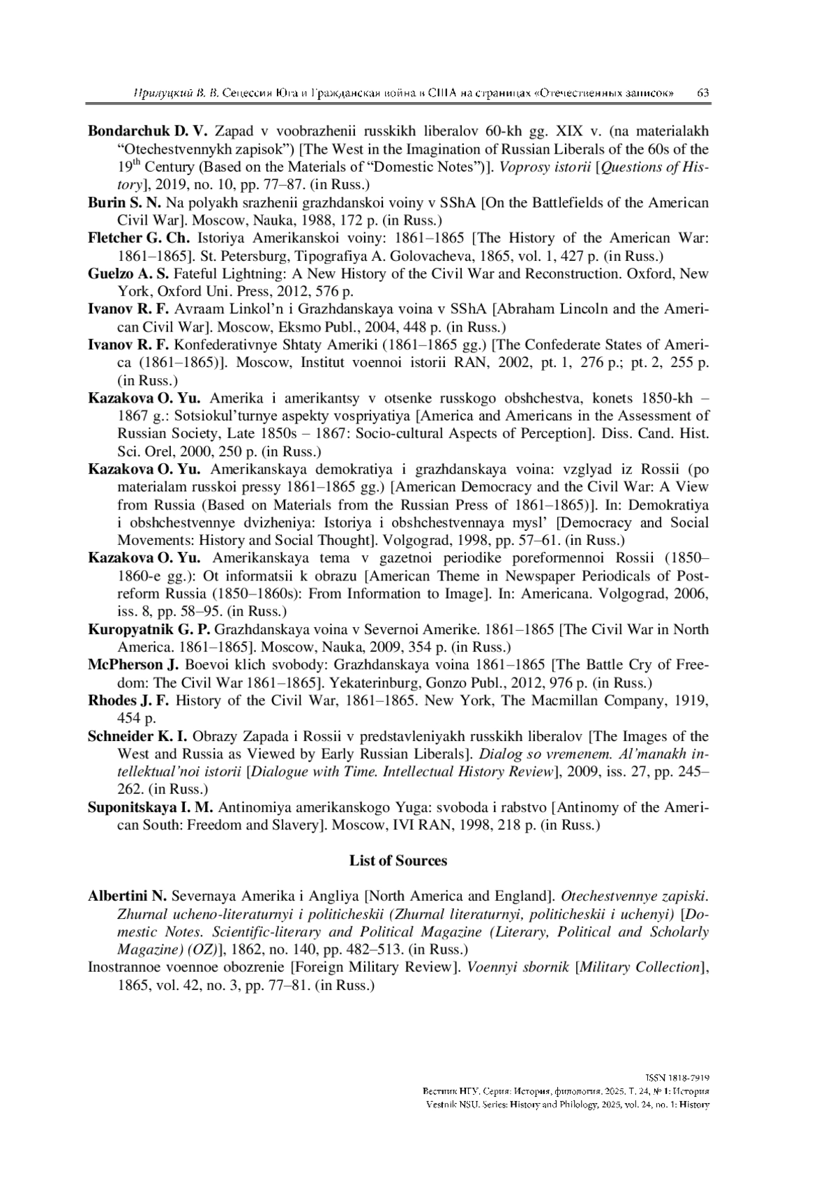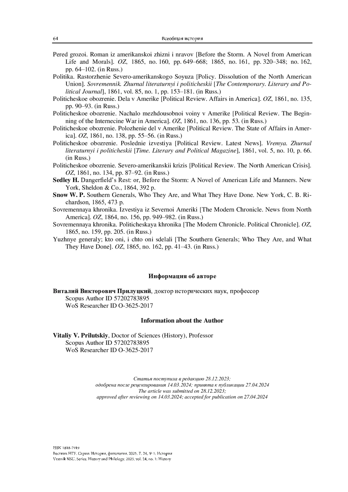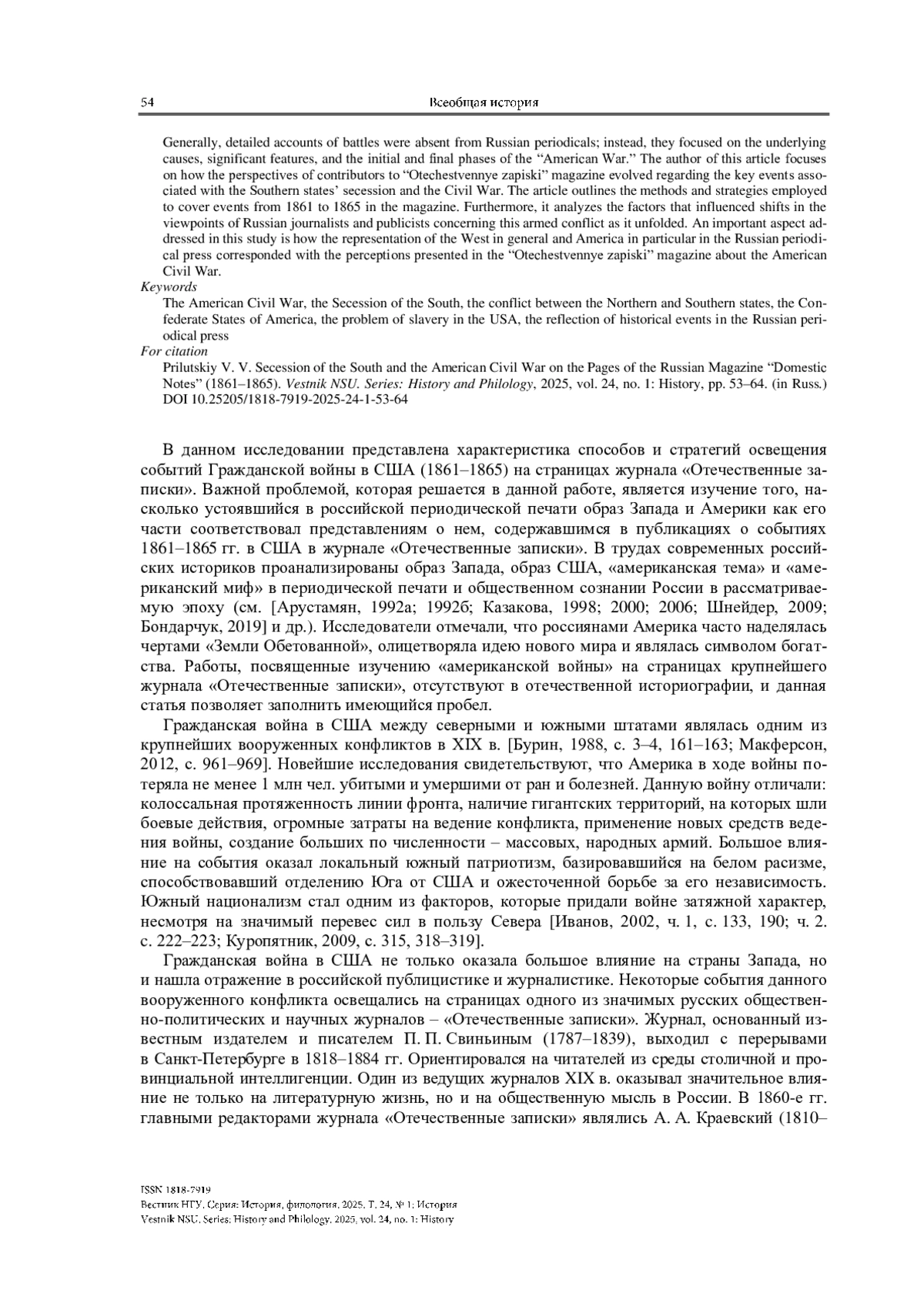 ПРИЛУЦКИЙ В. В. СЕЦЕССИЯ ЮГА И ГРАЖДАНСКАЯ ВОЙНА В США НА СТРАНИЦАХ РОССИЙСКОГО ЖУРНАЛА «ОТЕЧЕСТВЕННЫЕ ЗАПИСКИ» (1861–1865 ГОДЫ) // ВЕСТНИК НГУ. СЕРИЯ: ИСТОРИЯ, ФИЛОЛОГИЯ. 2025. ТОМ 24, № 1