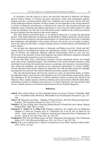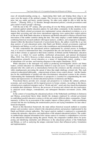 This paper comparatively examines the educational policies of the Netherlands in Indonesia and Britain in Malaya during the 19th – 20th centuries from the perspective of post-colonial theory. By using historical documents and synthesizing existing literature, the study reveals similarities and differences in their approaches. Notably, both implemented a “dual education” system, separating indigenous and Western-oriented education tracks, while adopting secular curricula and centralized administration. The Dutch were more flexible in language policies, whereas the British enforced stricter linguistic segregation. Influenced by the “divide and rule” strategy, segregated school systems for each ethnic group emerged, fostering communal divides. However, these policies inadvertently facilitated modernization, mass education, and female literacy. Moreover, they unintentionally nurtured an intellectual class that catalyzed nationalist movements. While serving colonial interests, the educational reforms laid foundations for modern, diversified education systems in post-colonial Indonesia and Malaysia. The paper contributes insights into colonial legacies and their complex ramifications on Southeast Asian societies development trajectories. It underscores how education served as a double-edged sword, both consolidating colonial rule and sparking movements towards independence and progress.