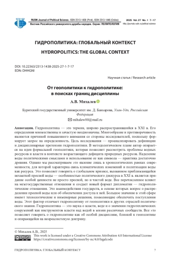 7. Лихачёва А.Б. “Ни воды, ни войны”: проблема пресной воды в международных отношениях первой четверти XXI века // Международная аналитика. 2023. № 4 (14). С. 21-36. ;. DOI: 10.46272/2587-8476-2023-14-4-21-36 EDN: FKSZQZ