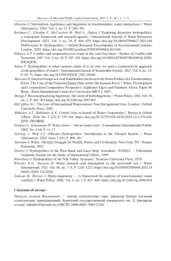 9. Allouche J. Nationalism, legitimacy and hegemony in transboundary water interactions // Water Alternatives. 2020. Vol. 2, no. 13. Р. 286-301.