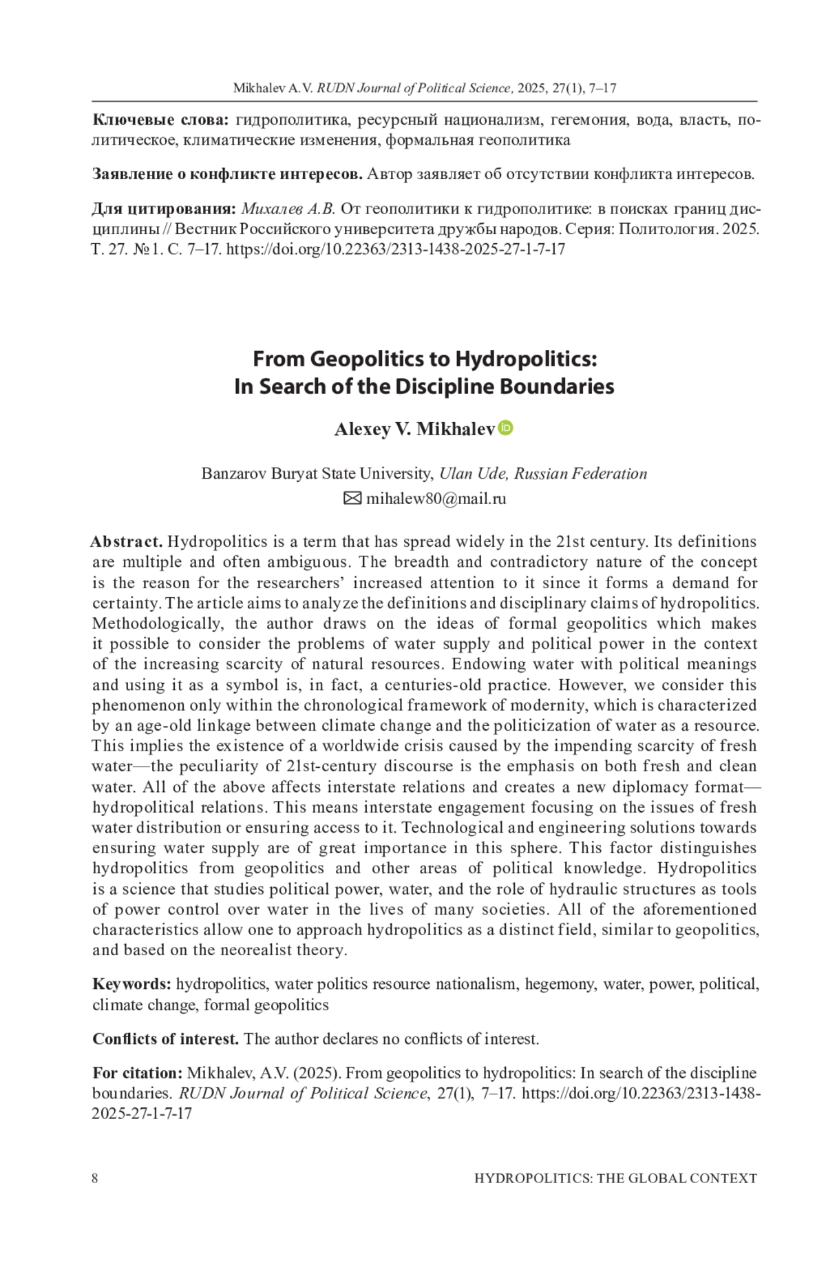 10. Bréthaut C., Ezbakhe F., McCracken M., Wolf A., Dalton J. Exploring discursive hydropolitics: a conceptual framework and research agenda // International Journal of Water Resources Development. 2022. Vol. 3, no. 38. P. 464-479,. DOI: 10.1080/07900627.2021.1944845 EDN: CDULNM