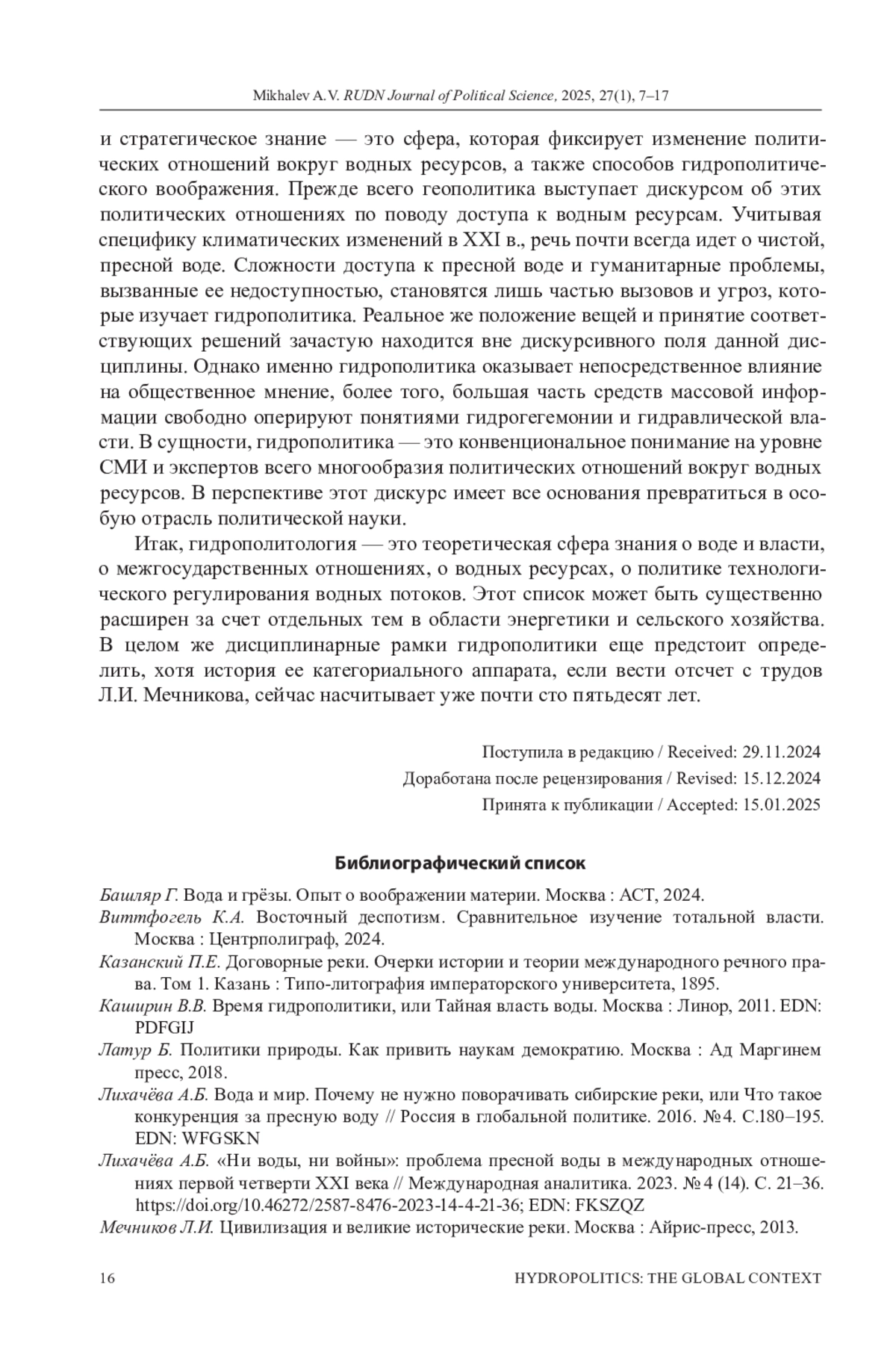 6. Лихачёва А.Б. Вода и мир. Почему не нужно поворачивать сибирские реки, или Что такое конкуренция за пресную воду // Россия в глобальной политике. 2016. № 4. С.180-195. EDN: WFGSKN