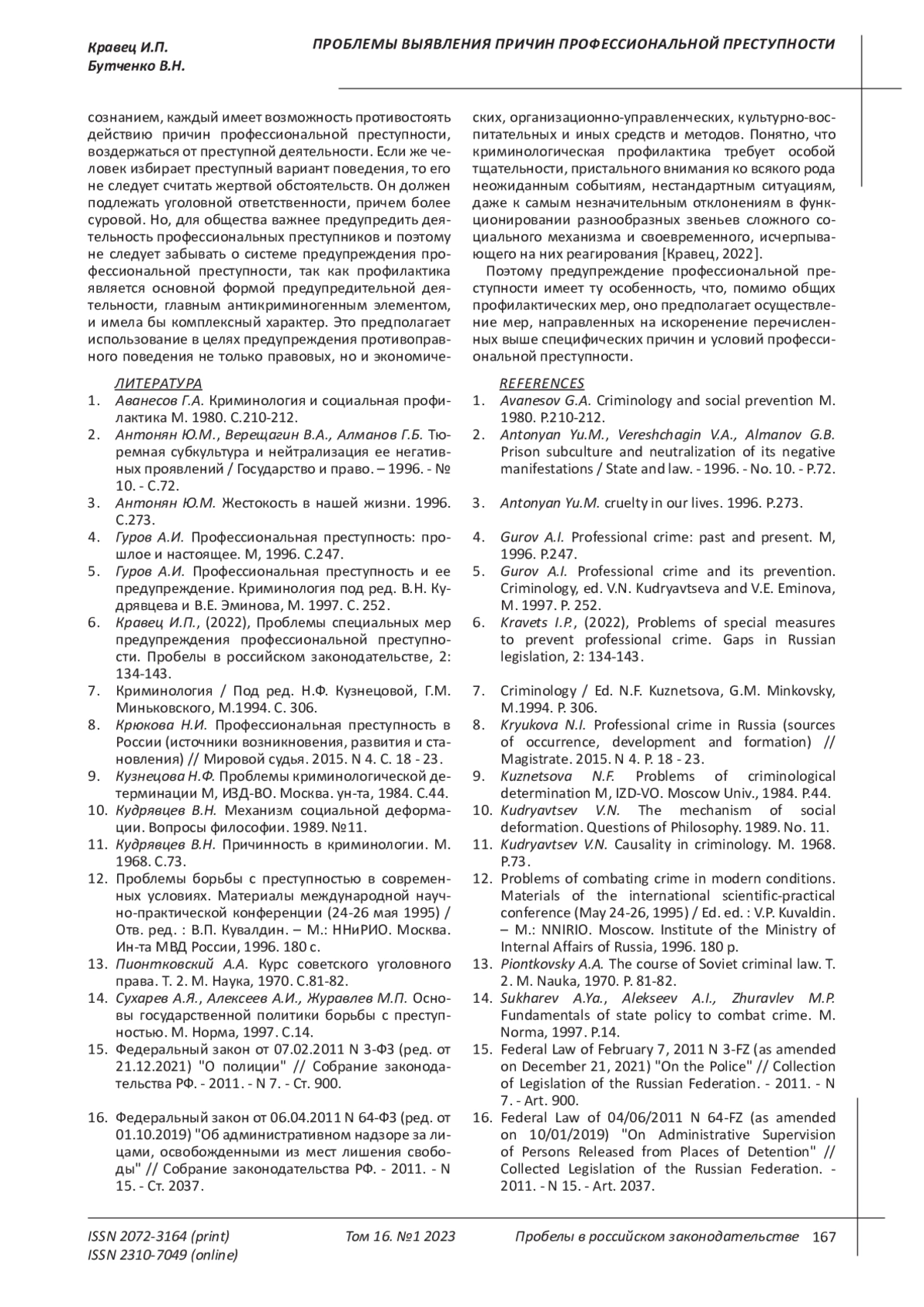 6. Кравец И.П., (2022), Проблемы специальных мер предупреждения профессиональной преступности. Пробелы в российском законодательстве, 2: 134-143. EDN: PZUKUF